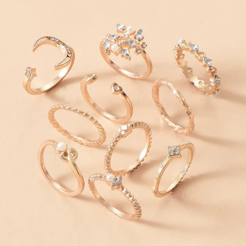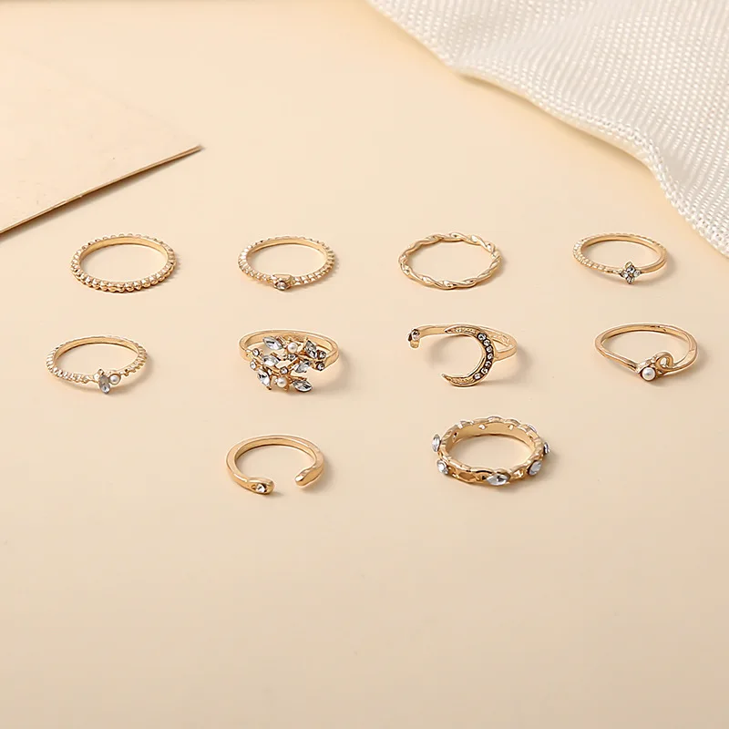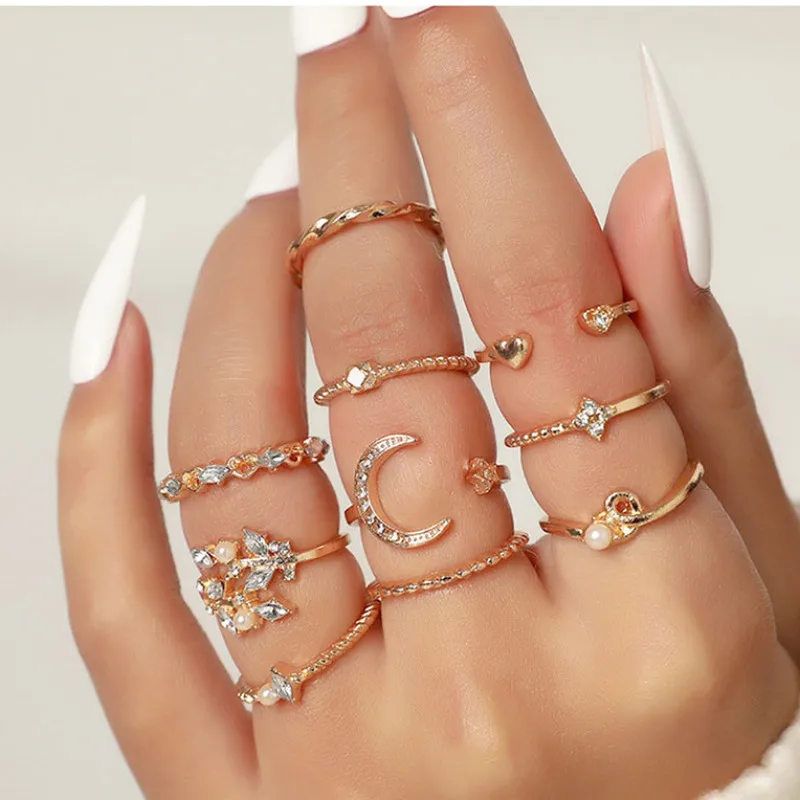 10PCS Set Fashion Rings for Women Vintage Gold Plated Finger Ring Party Jewelry