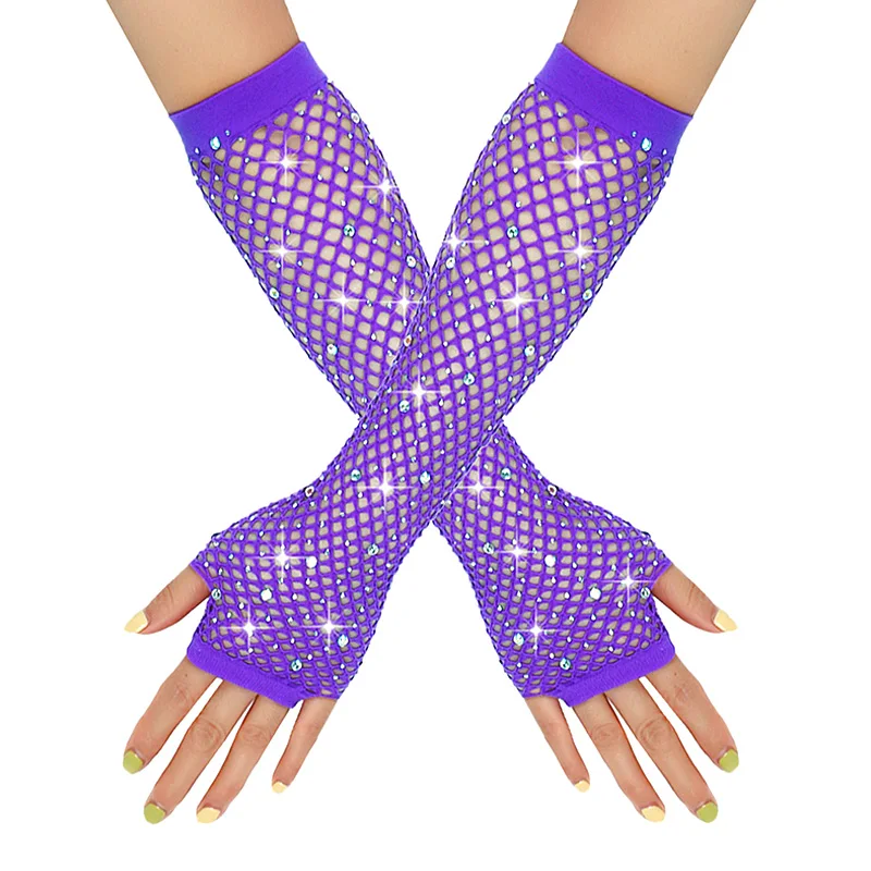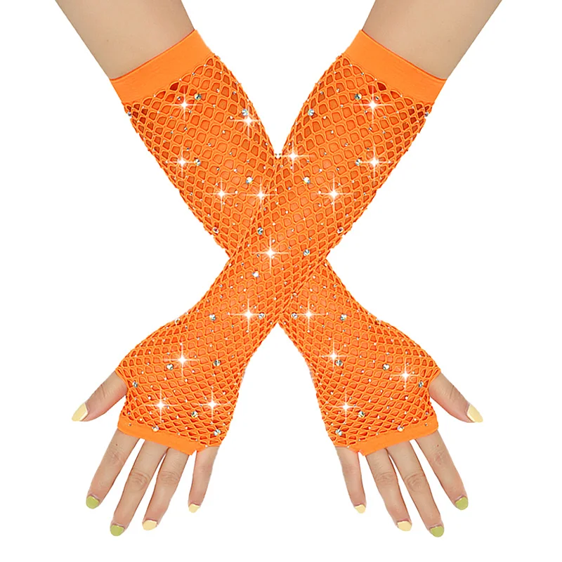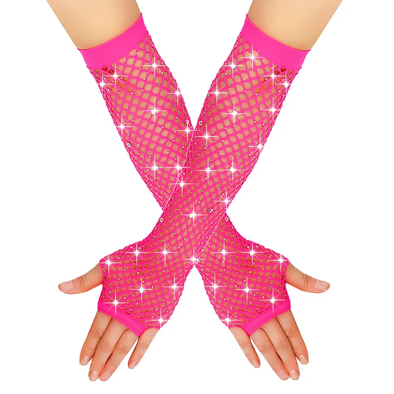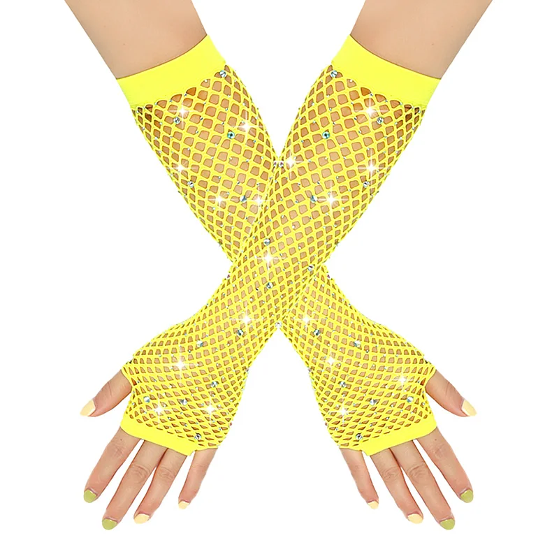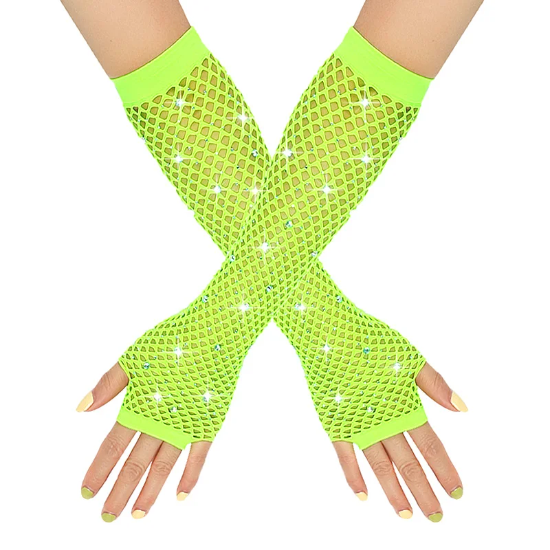 1pair Neon Fishnet Fingerless Long Gloves Rhinestone Arm Cuff Party Wear Fancy Dress For Womens Sexy Punk Goth Dance Mesh Gloves