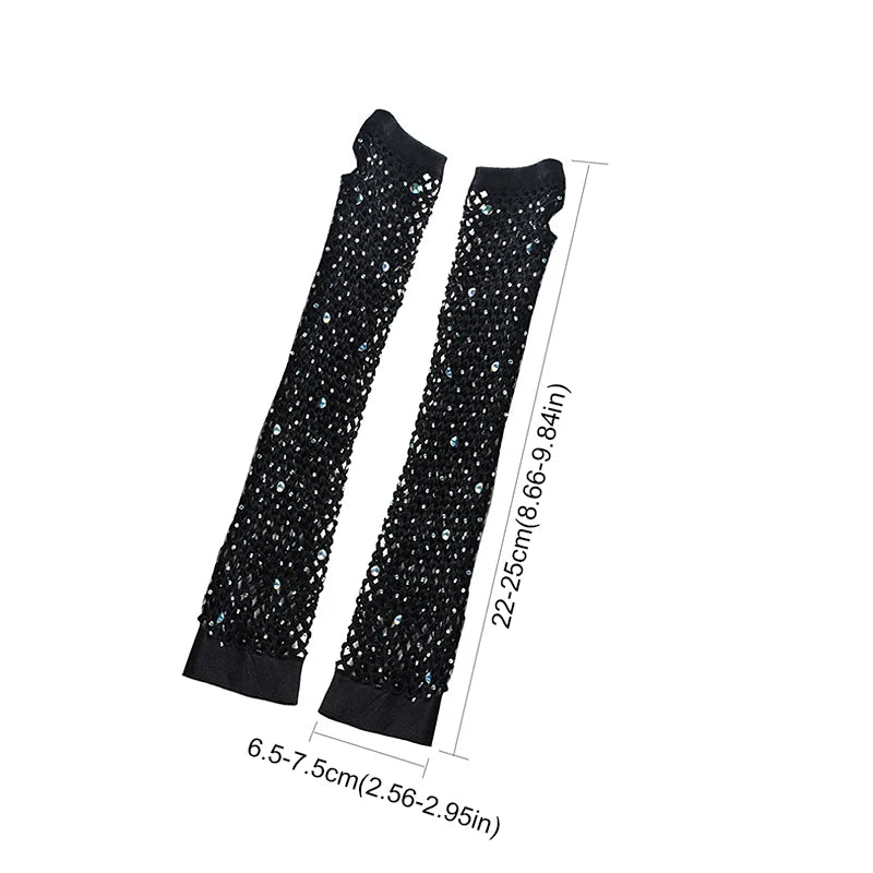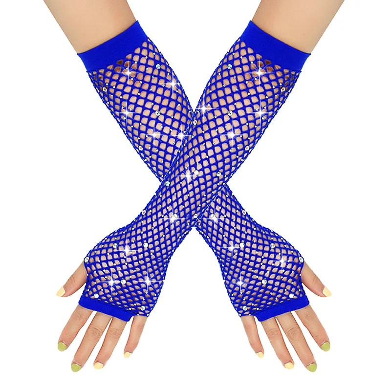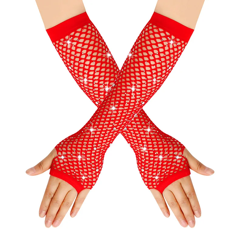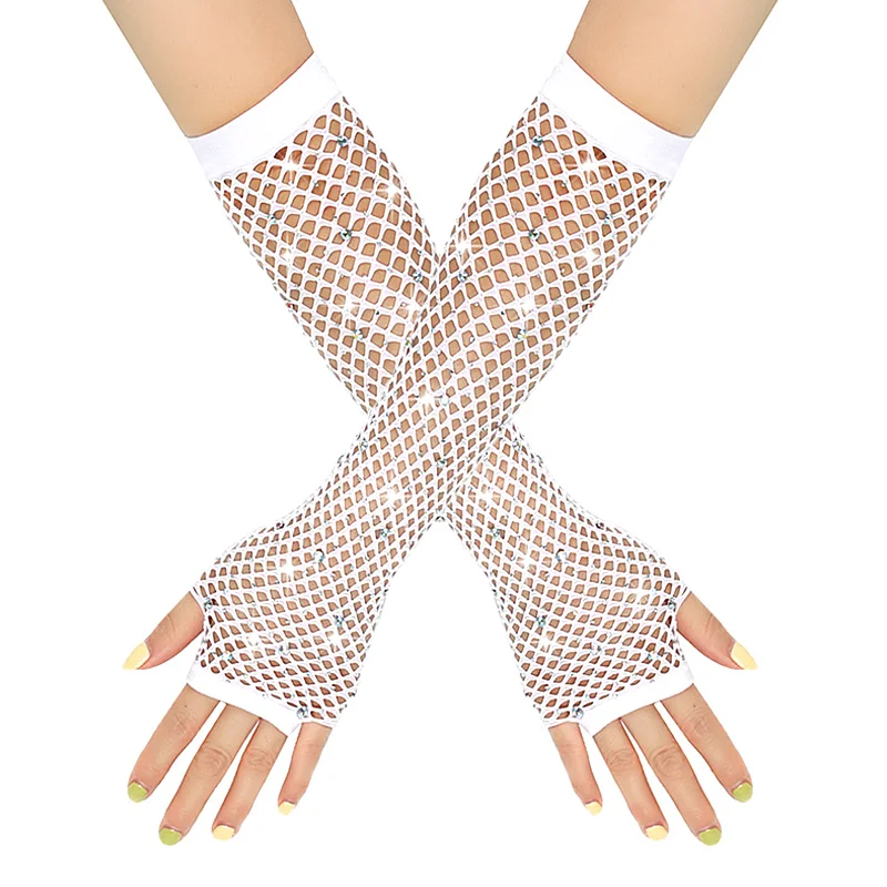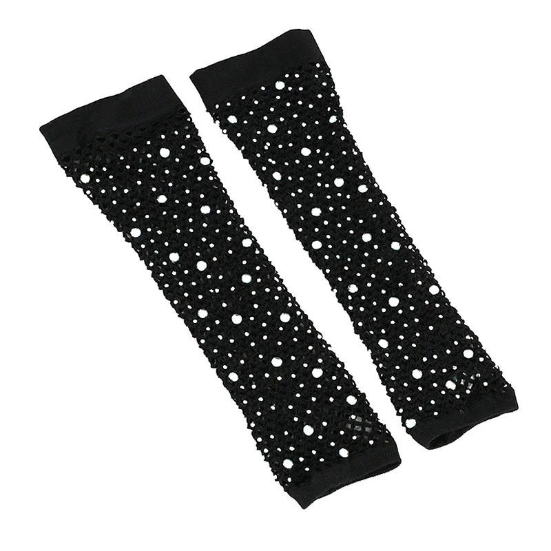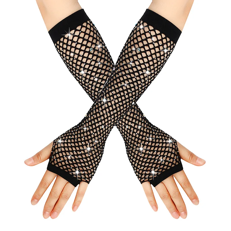 Glittering Gloves: dozens of rhinestones set in these fishnet gloves are more glamorous than ordinary cosplay gloves.
