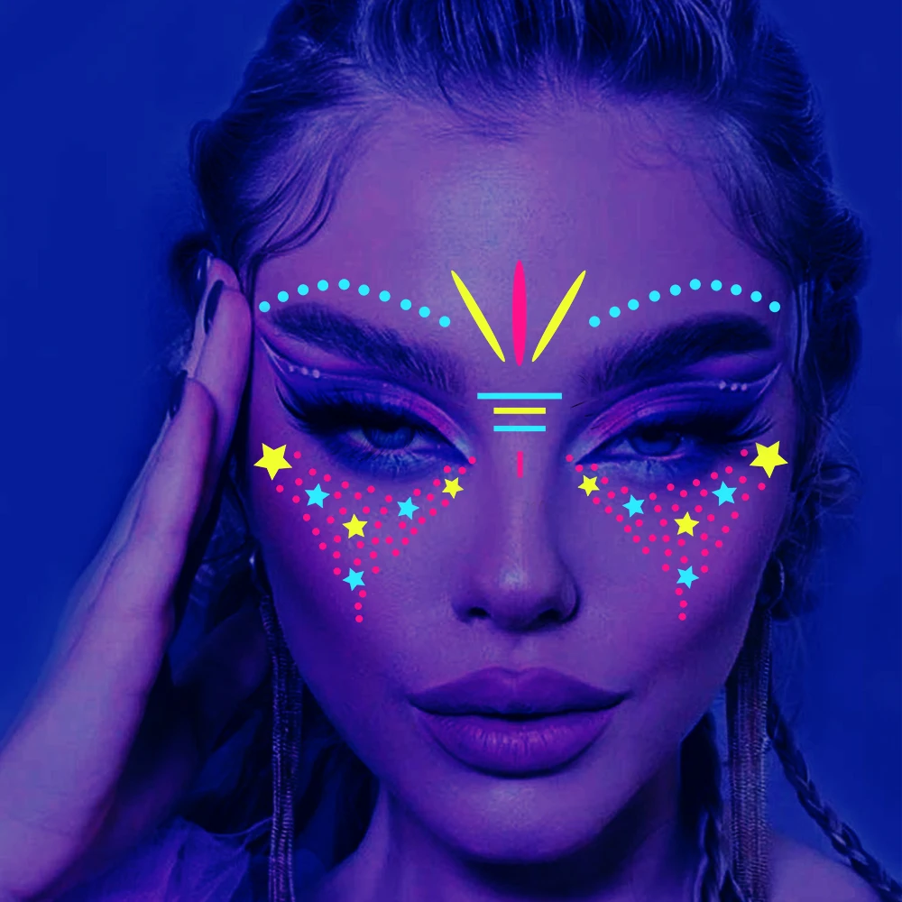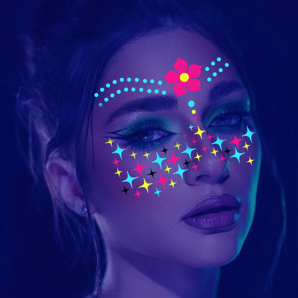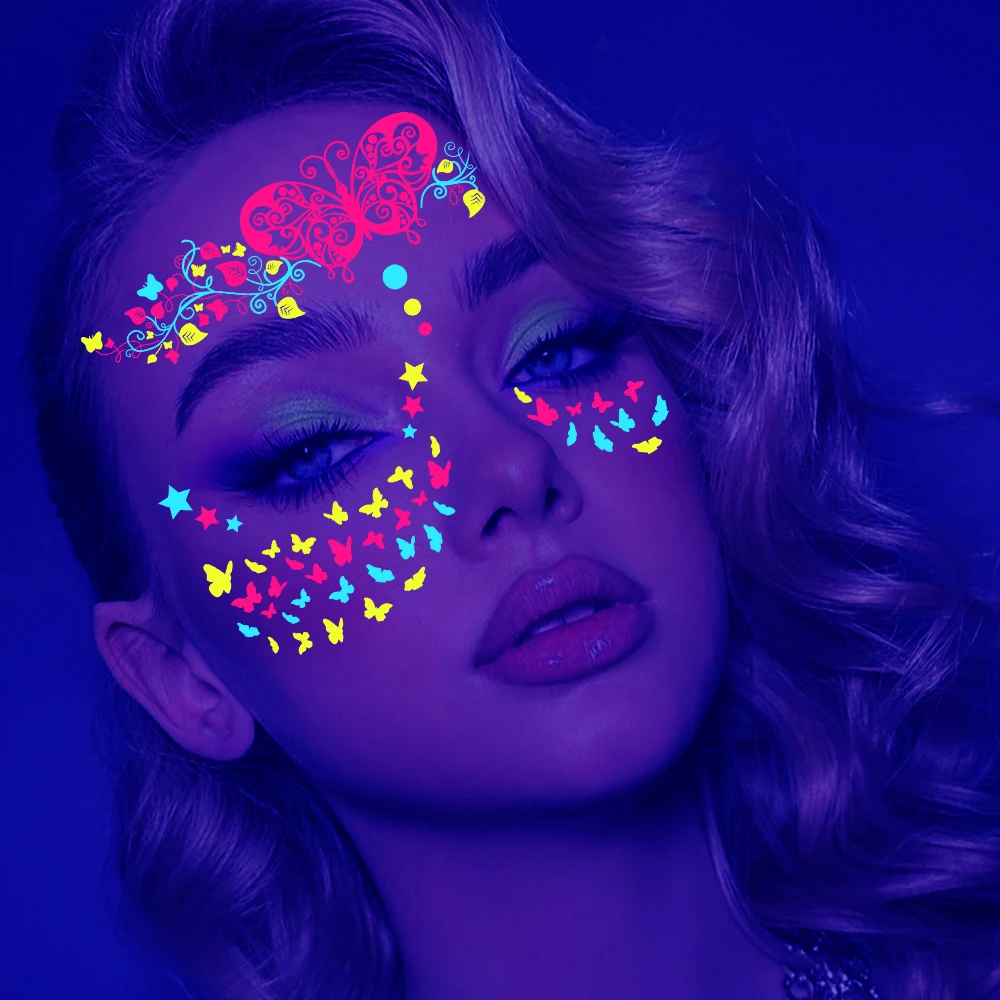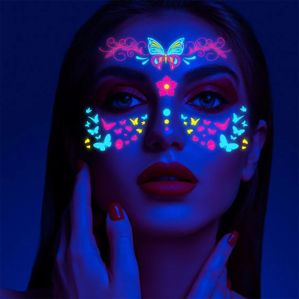 1Pcs Halloween Fluorescent Face Stickers 12-Styles Feather/Flowers/ButterflyDesign Tattoo Sticker Waterproof Glowing Face Decals