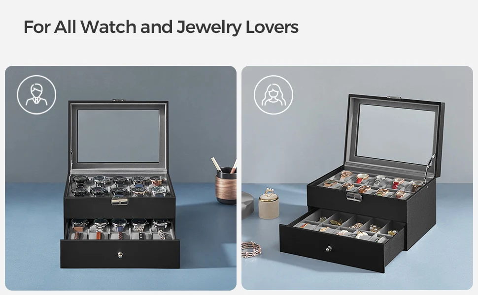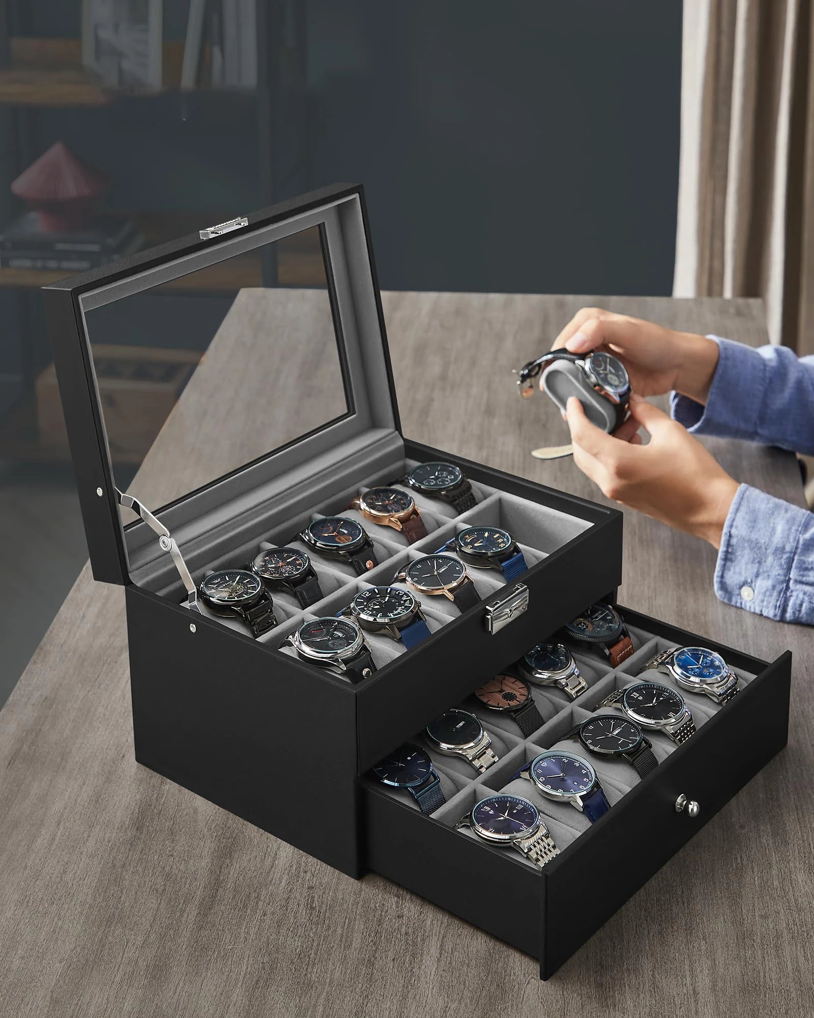 20-Slot Watch Organizer Case, Watch Case with Glass Lid, 2 Layers, Lockable Watch Display Case, Black Synthetic Leather, Gray