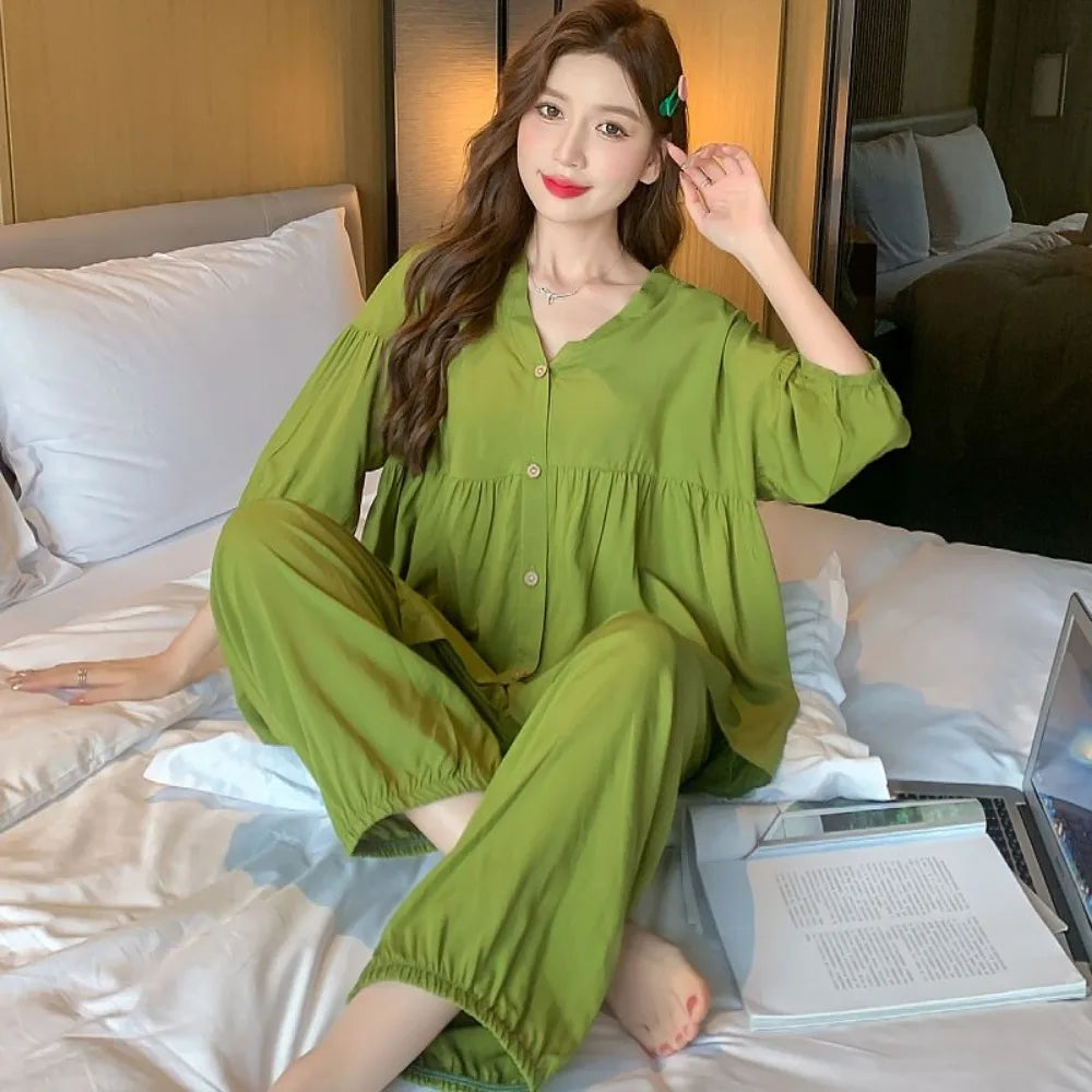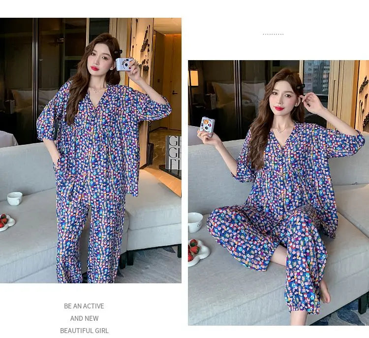 2023 New Cotton Silk Summer Pajamas Suit Plus Size Loose Ladies Home Clothes Two-piece Casual Style Thin