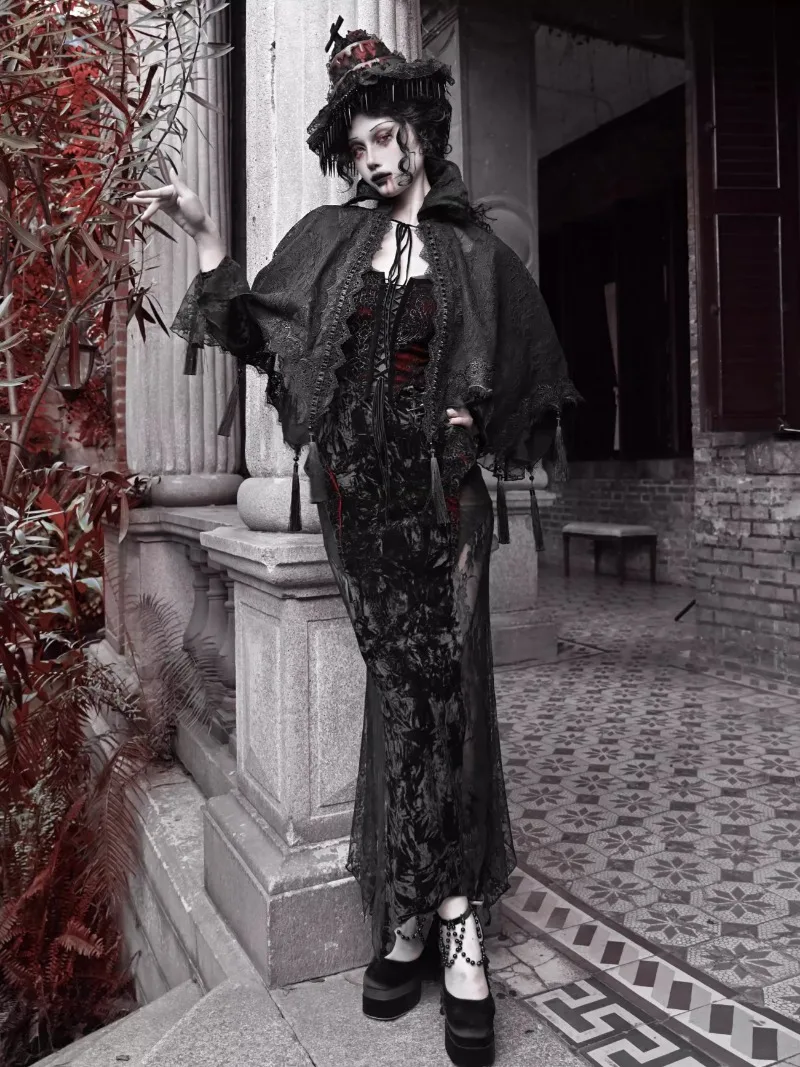 2024 Autumn Winter Halloween Chic Lace-Up Wrap Women's Clothes New Dark Style Goth Lace Cape Shawl Jacket Apparel Accessories