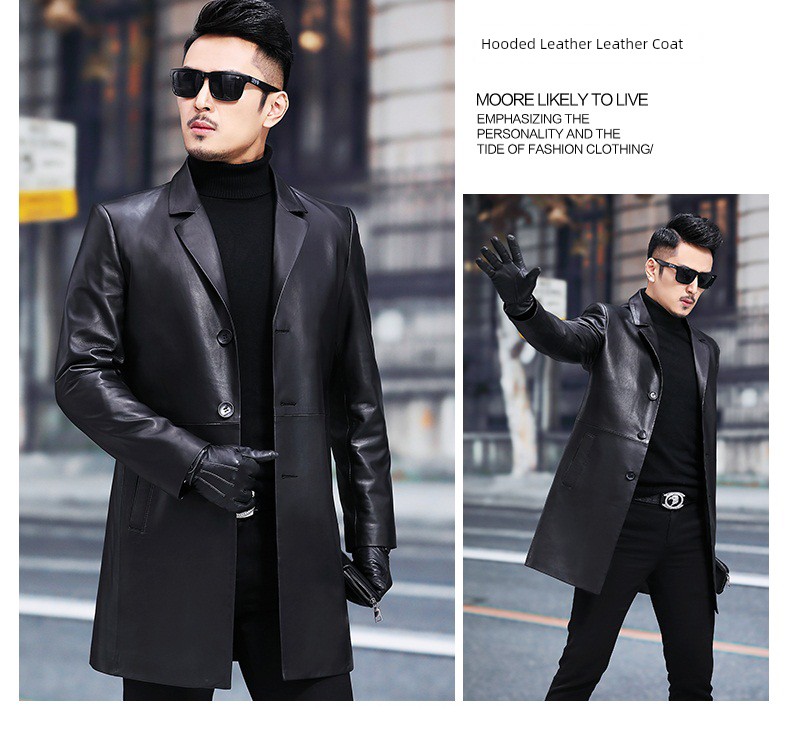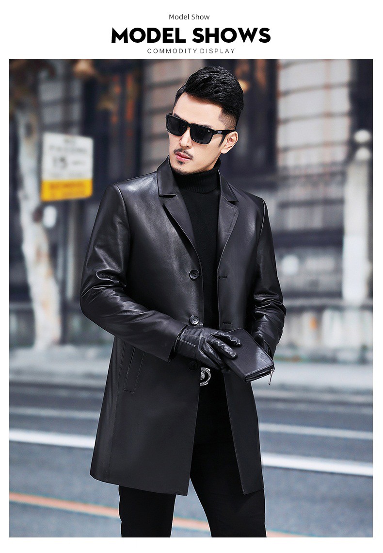 2024 New Arrival Haining Genuine Leather Clothes Men's Mid Length Long Length Trench Coat Fur Outwear Silm K-style Suit Collar Leather Jacket