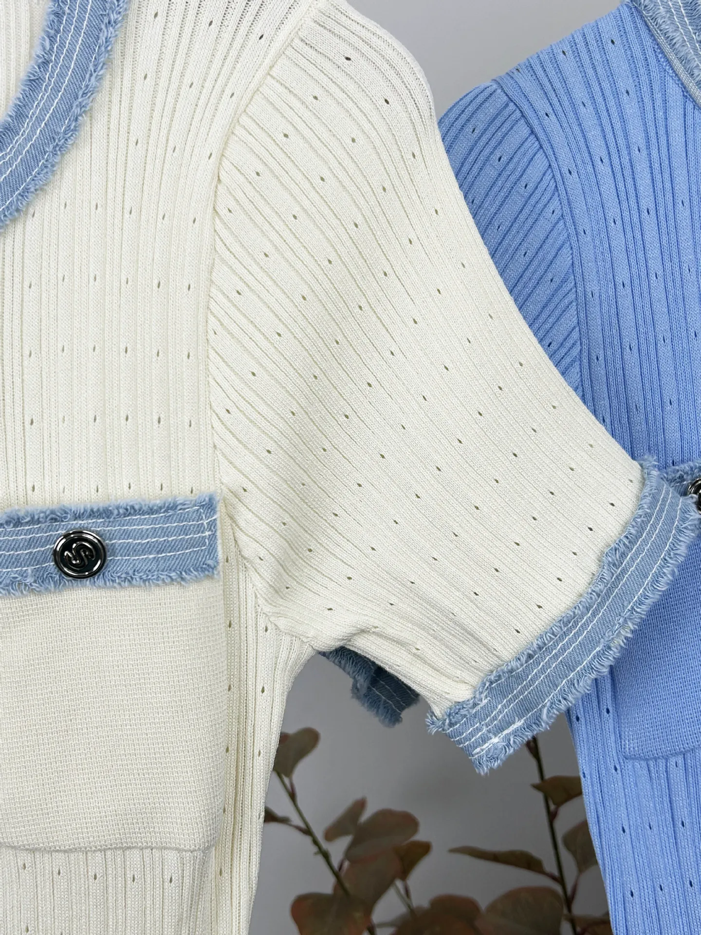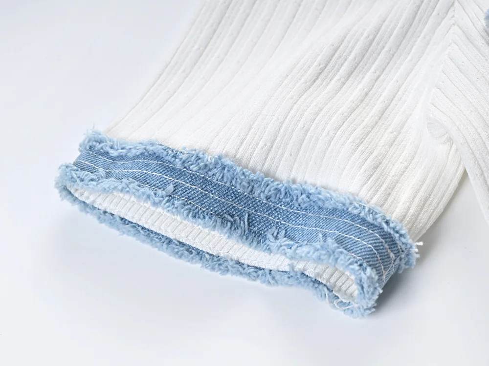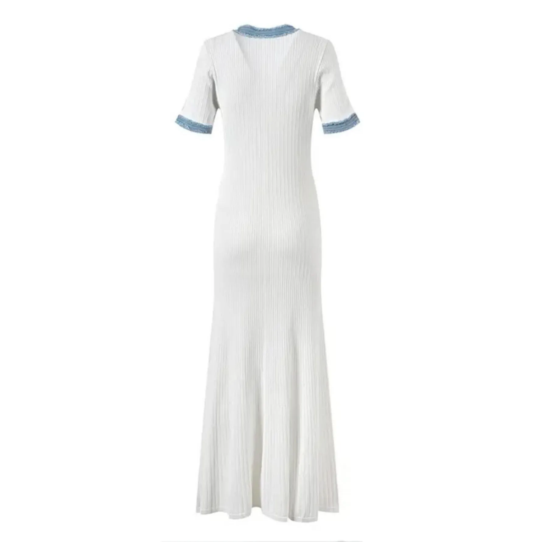 2024 New Summer Elegant Women Knitted Maxi Dress Chic O-neck Short Sleeve Denim Patchwork Bodycon Dresses Office Lady Robe