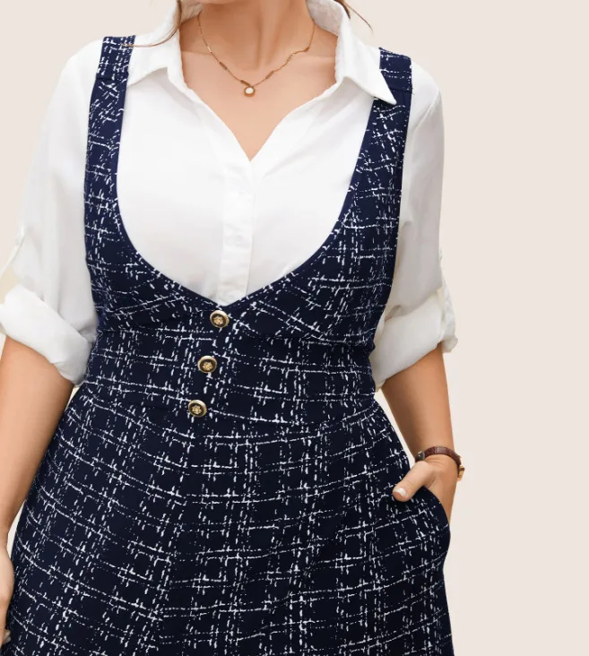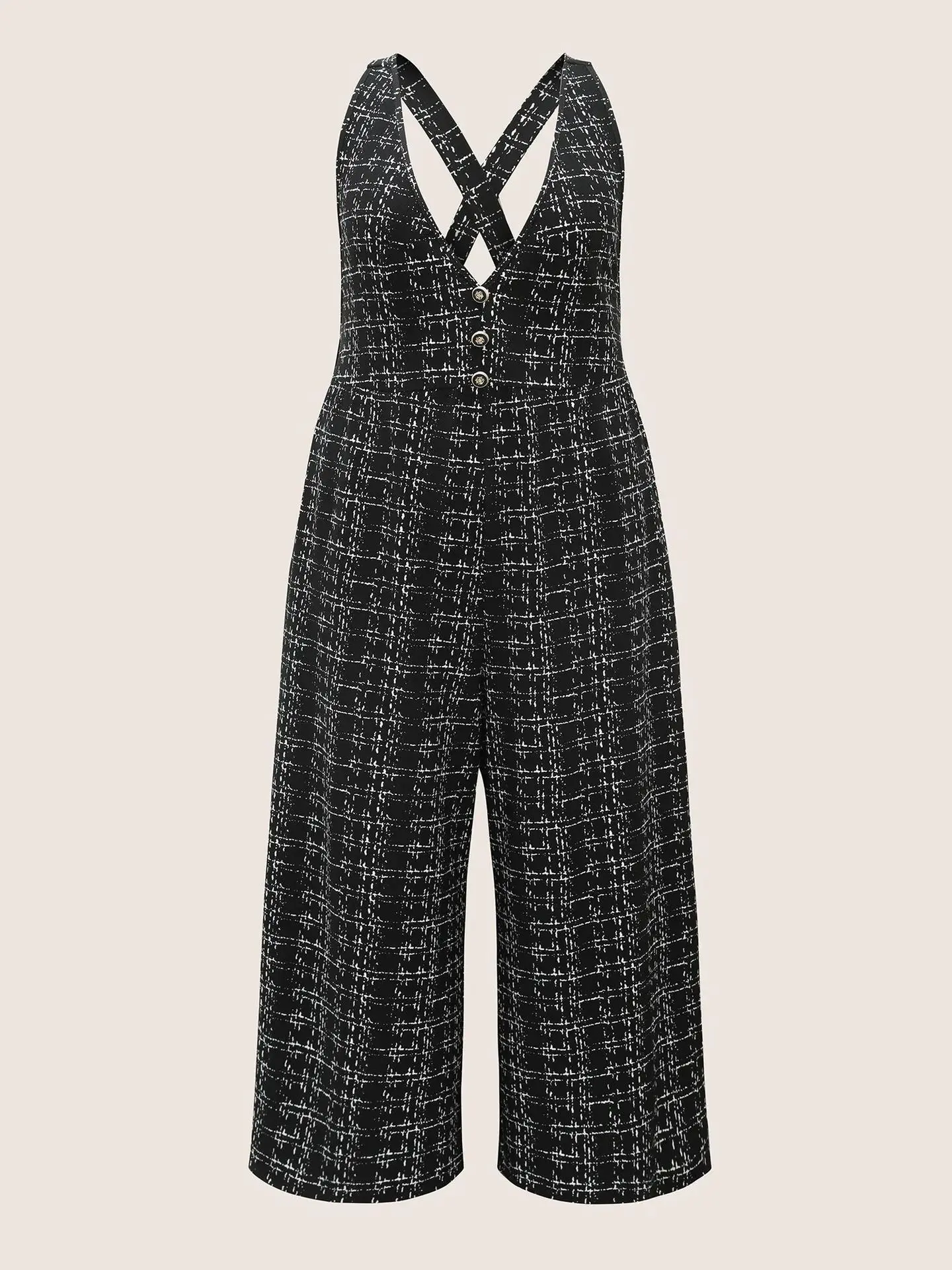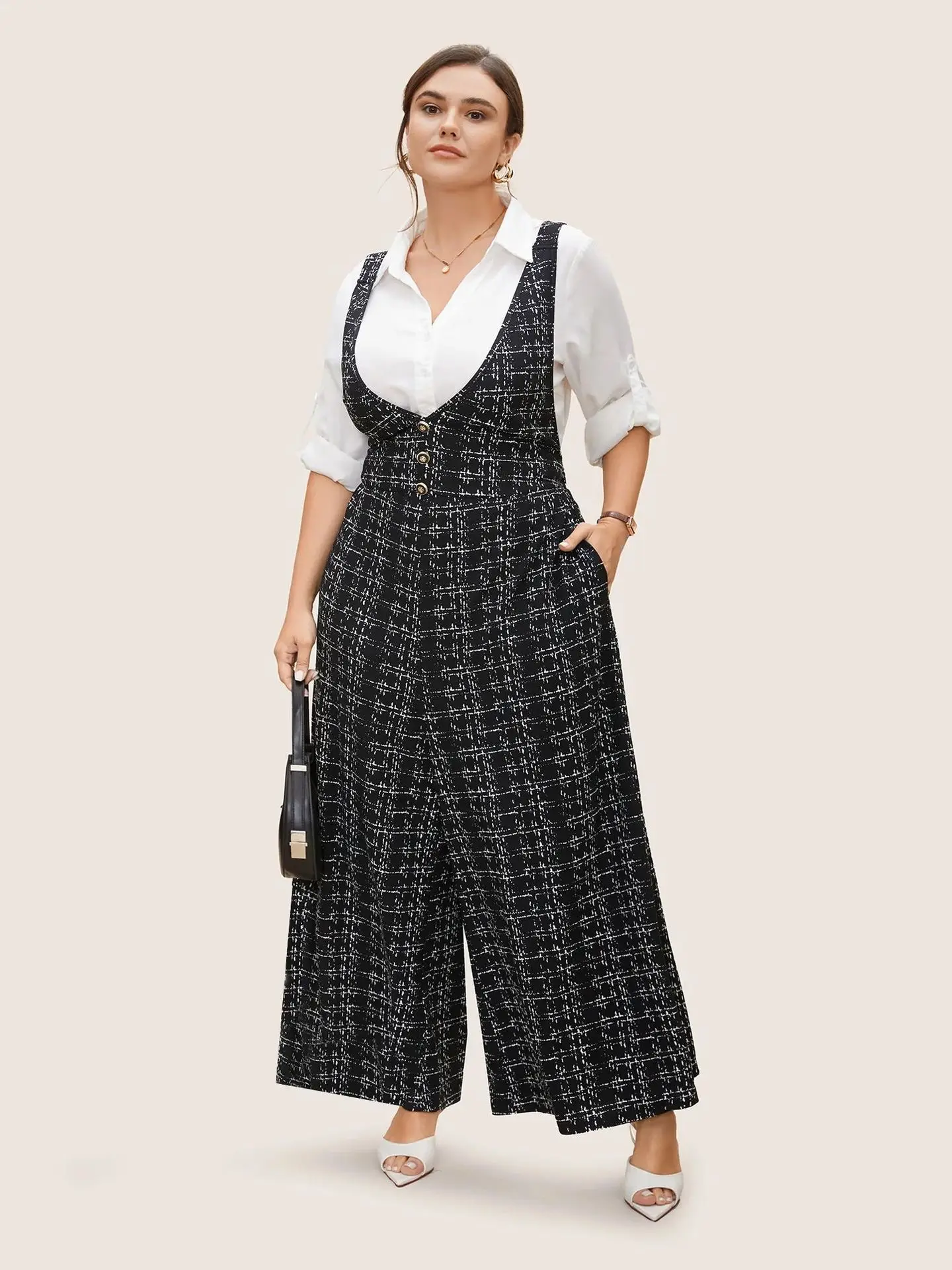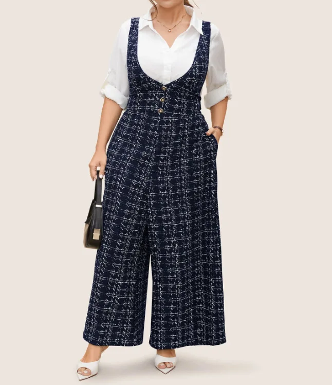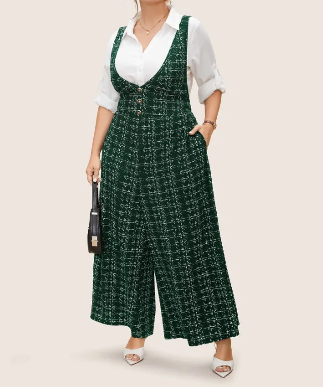 2025 Women's Sleeveless Oversized Jumpsuit Overalls Ladies Sexy Plaid Deep V Neck Wide Leg Pants Jumpsuits with Buttons Pockets