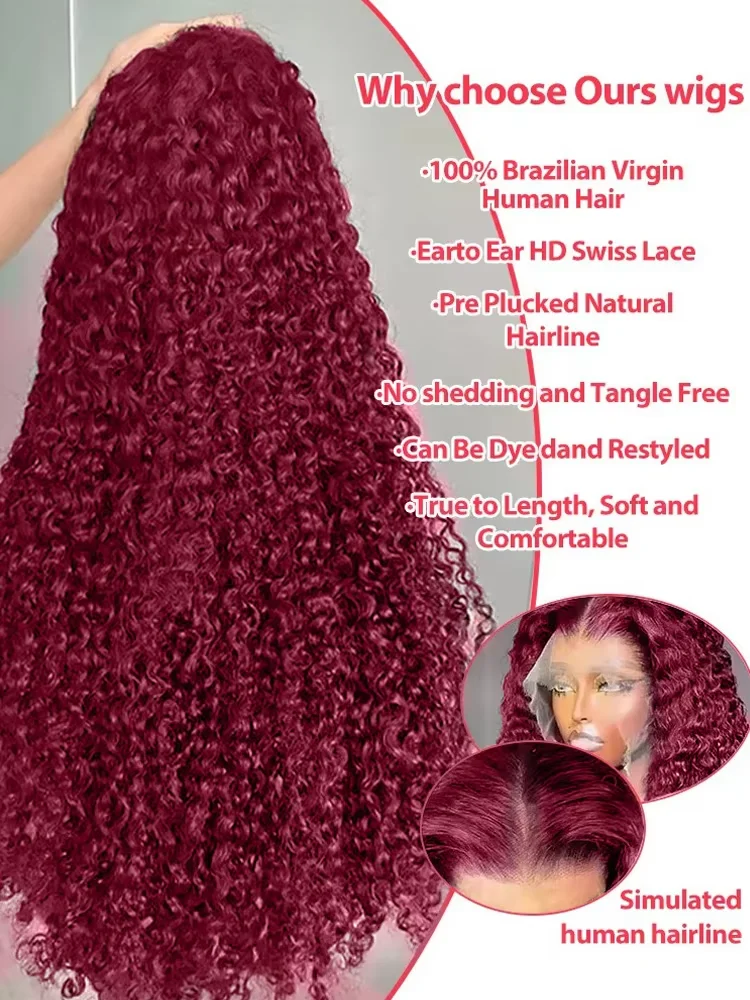 250 Density 13x4 Curly 99J Burgundy Lace Front Wig Red Wine 30 Inch Deep Wave Brazilian HD Glueless Lace Frontal Human Hair Wigs