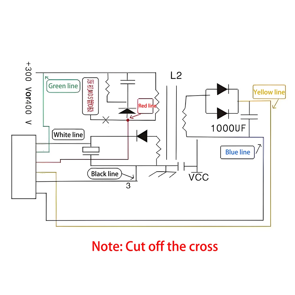 3. The red wire is connected to the C-pole of the original switch tube, and the soldering point (i.e. 300V transformer) field-effect tube is of D-level.