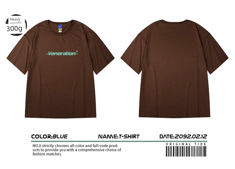 300G Heavy Weight American Letter Print Short-Sleeve T-shirt Street Plus Size Black round Neck Cotton Simple Half Sleeve Men's Fashion