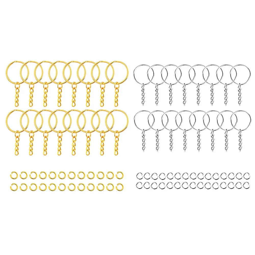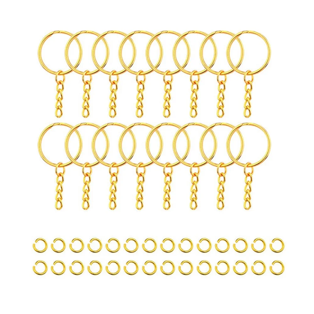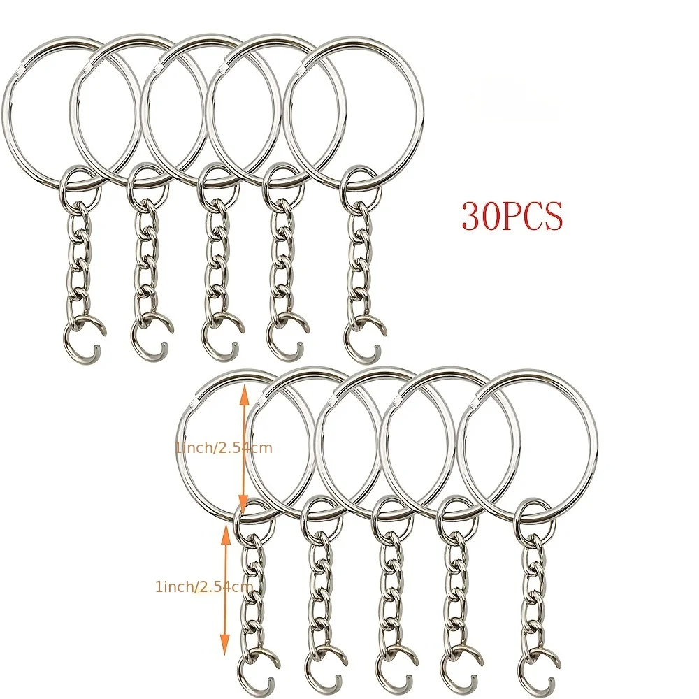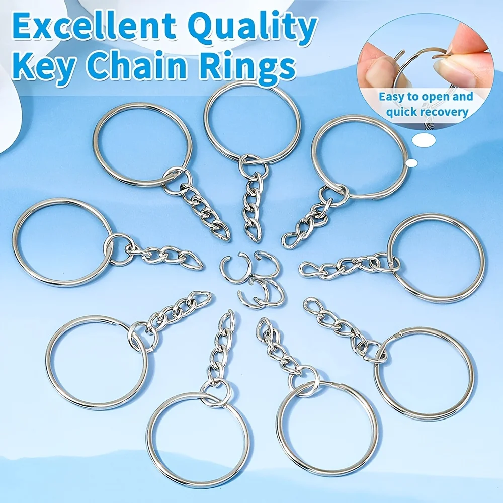 Durable material : Made of ultra strong with silver-toned nickel metal, durable and firm.Polished round ring,great workmanship with the ring,smooth surface and edge, will not scratch your hands and stuffs.Packge content : It includes 30 PCS key rings with chain and 30 PCS open Jump Rings.It is very great to get bulk items at reasonable price.Great for DIY : The key ring design with chain and connectors, you do not need to buy additional parts.
