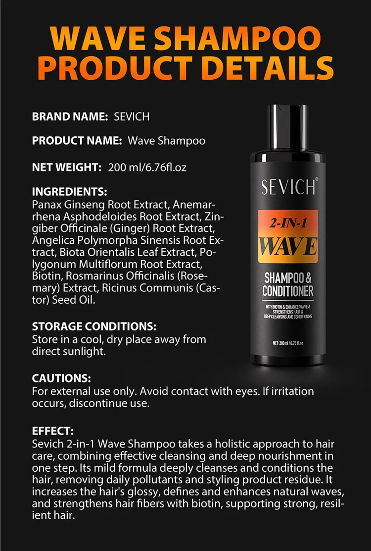 EFFECT:Sevich 2-in-1 Wave Shampoo takes a holistic approach to hair care, combining effective cleansing and deep nourishment in one step. Its mild formula deeply cleanses and conditions thed hair, removing daily pollutants and styling product residue. It increases the hair's glossy, defines and enhances natural waves, and strengthens hair fibers with biotin, supporting strong, resilient hair.