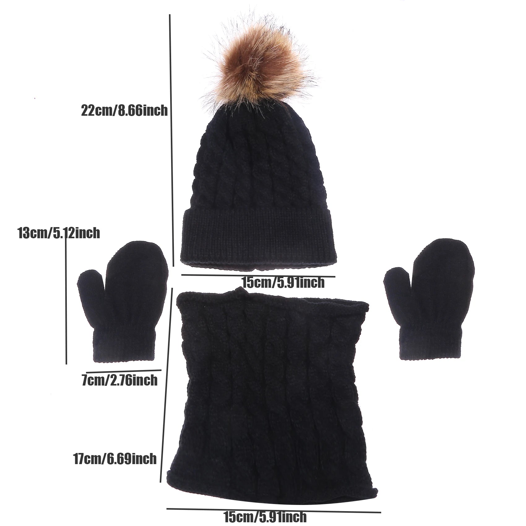 Size: Hat Length*Width:22*15cm,Scarf Length*Width:17*15cm,Glove Length*Width:13*7cm,Error about 1cm.