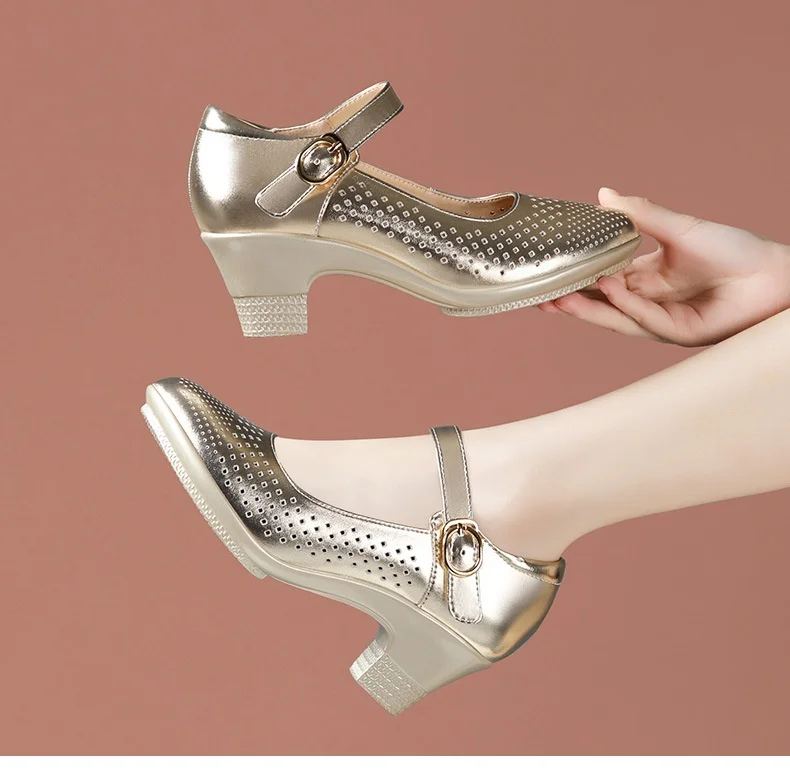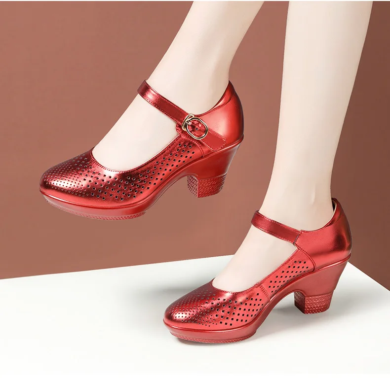 5.5cm 7.5cm Small Size 33 Breathable Cutout Block Heels Shoes Mary Janes 2024 Soft Leather Platform Pumps for Mom Dance Model