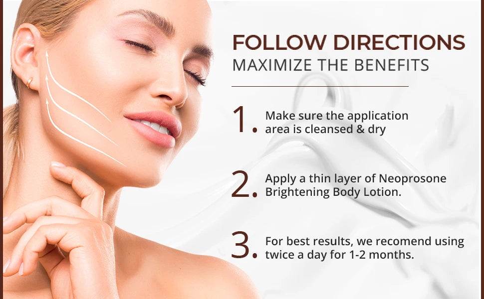 With the ingredients like Glutathione, Vitamin C, kojic acid, etc, which well works for skin whitening, lightening and brightening. It could remove the spots on body, glow the skin and make the skin in brightening good condition