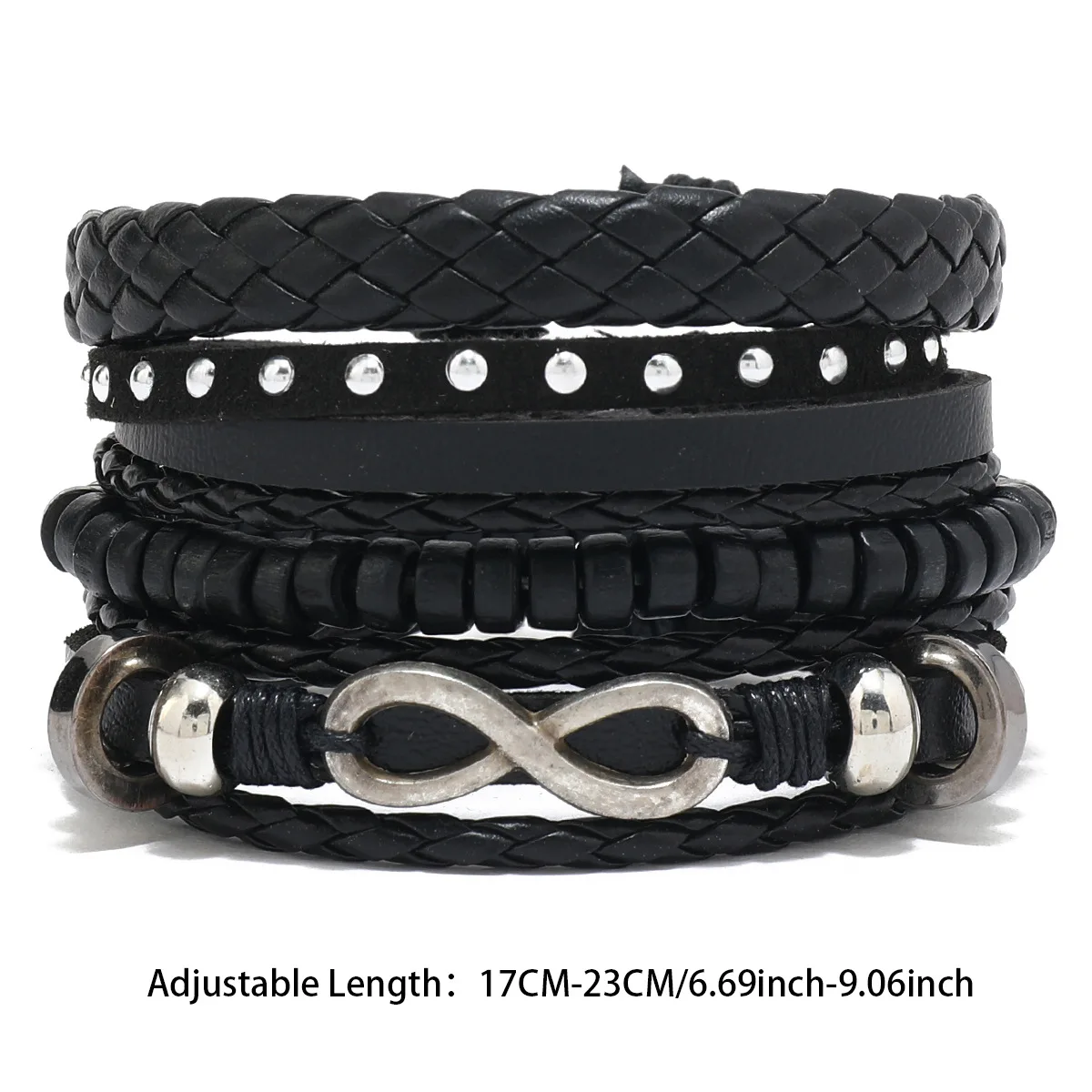 【4pcs-Black】4 Style Wood, Leather bracelet is Made with elastic cord, these bracelets are not only easy to put on or take
