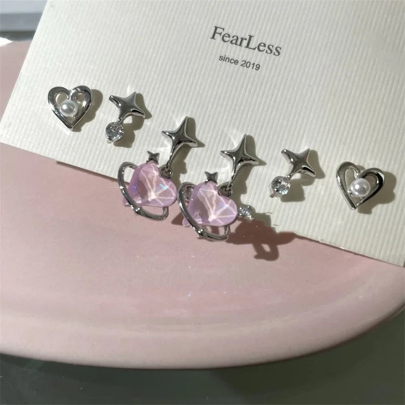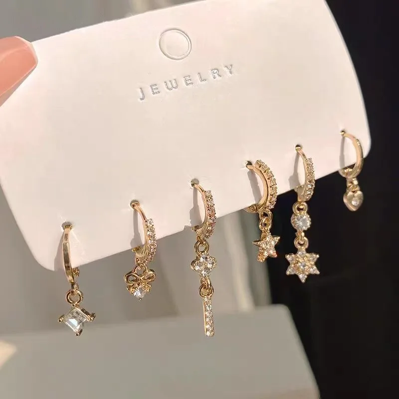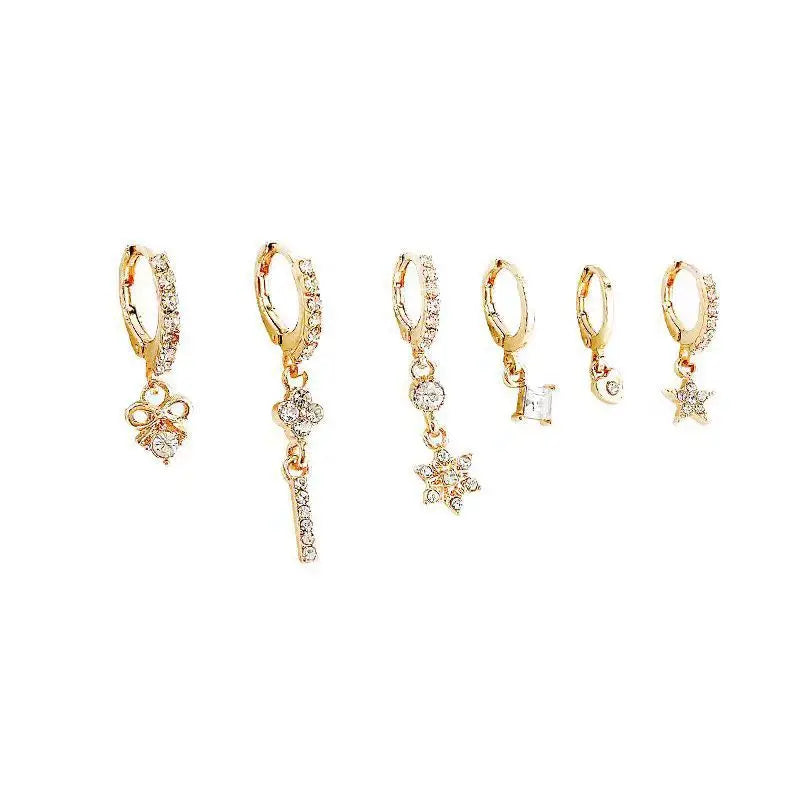 6Pcs/Set New Gold Color Geometric Pendant Hoop Earrings for Women Crystal Star Heart Bow Drop Earring Cartilage Piercing Jewelry