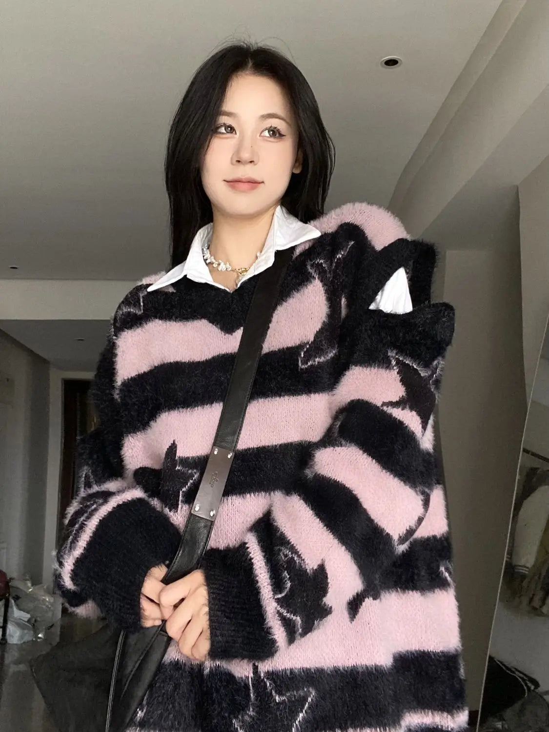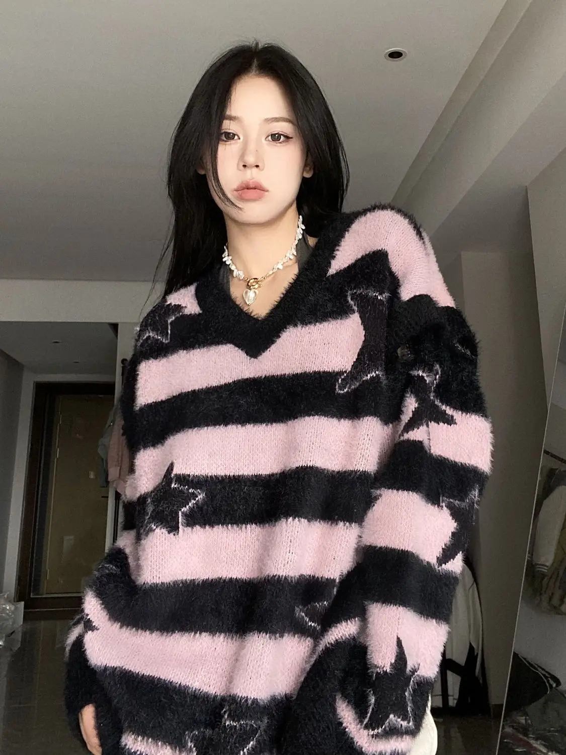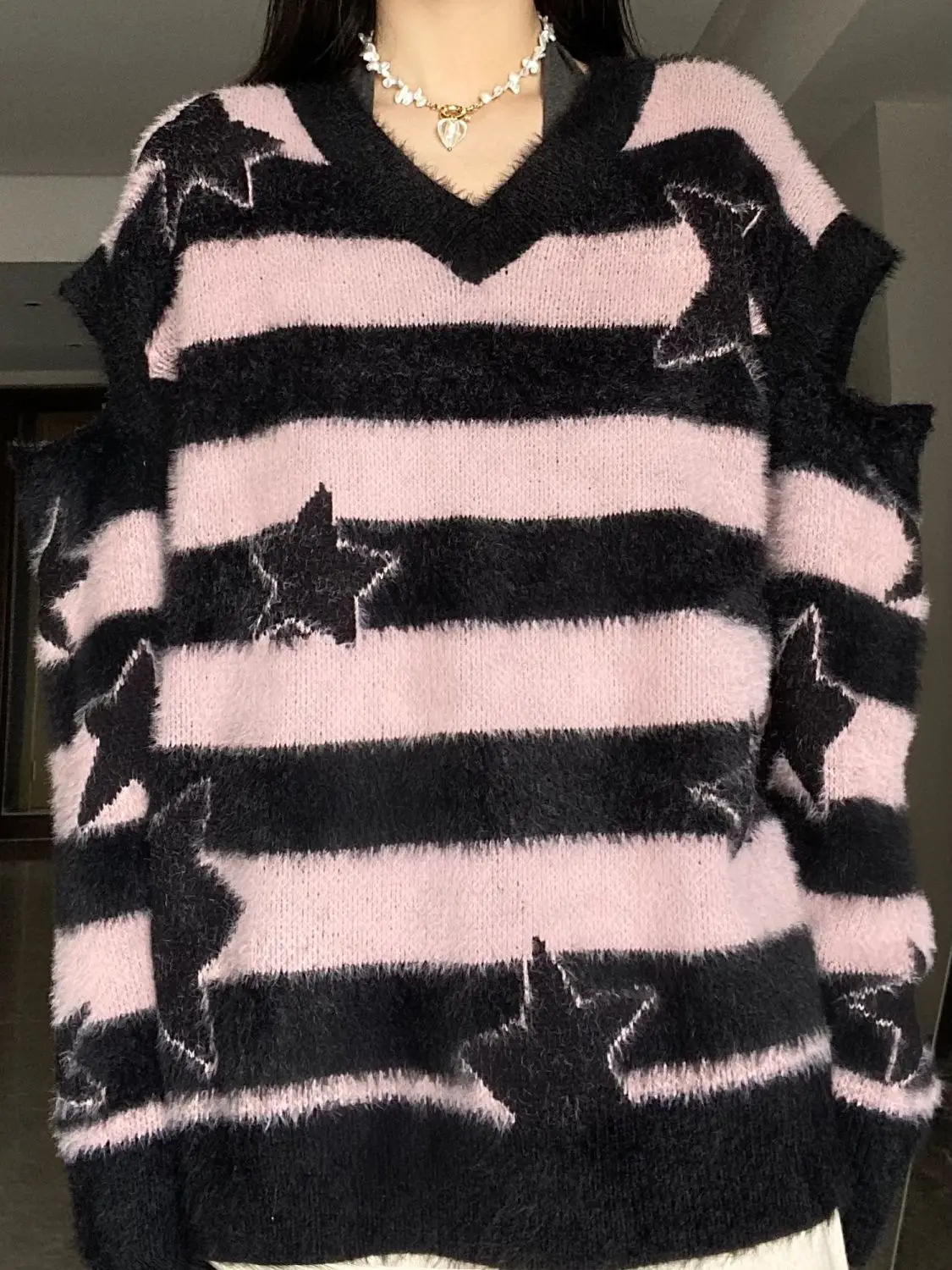 ADAgirl Harajuku Striped Sweater Oversize Y2k Style Pink Detachable Sleeves Star Print Jumpers Gothic Winter Korean Alt Clothes