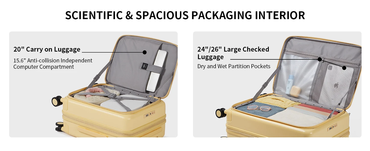 【40mm Expandable & Organized】 20 inches has a Vibration-proof computer compartment; 24/26 inches include a wet-dry zone to separate clothes, shoes, or toiletries.