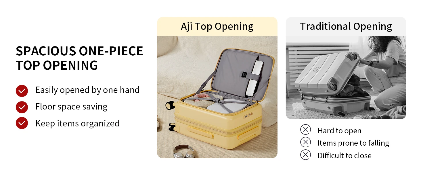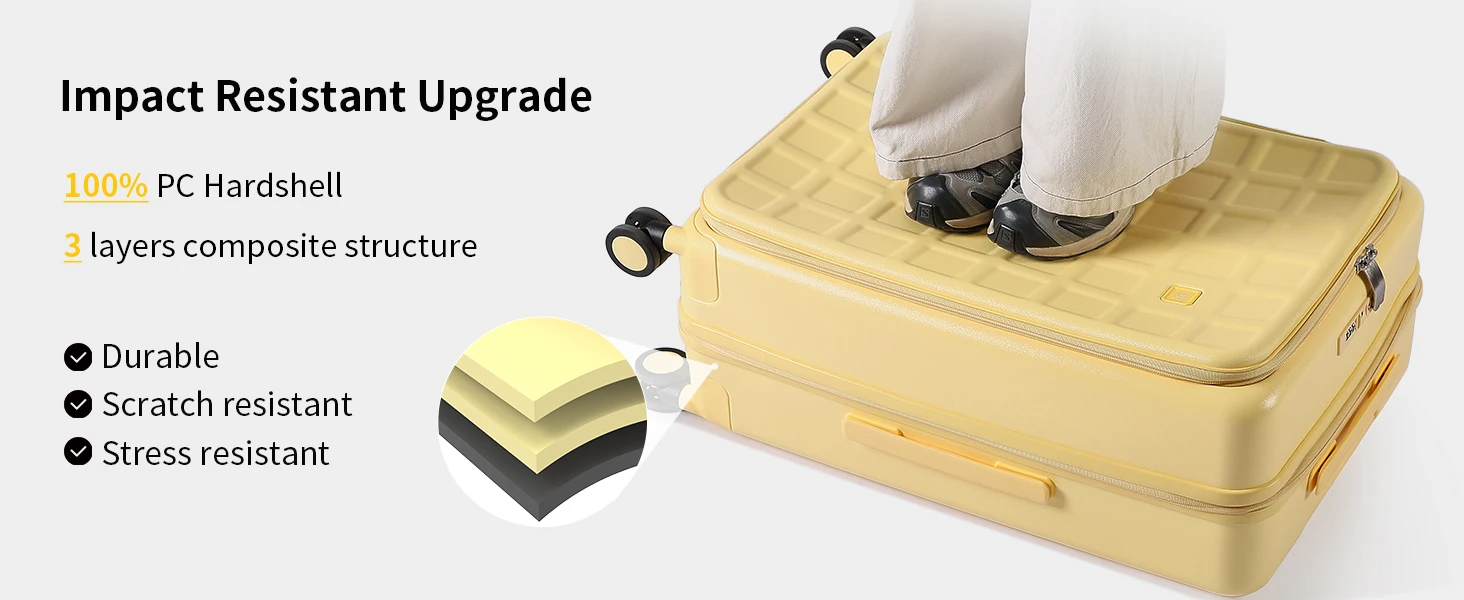 【Creative Front Opening】1:9 large deep position ratio structure, easy to open or close the luggage, not only easy to load, but also save space. This design solves the dilemma of separating 2 heavy-duty compartments for traditional luggage, which is then difficult to open and close. Importantly, it also prevents items from shifting.