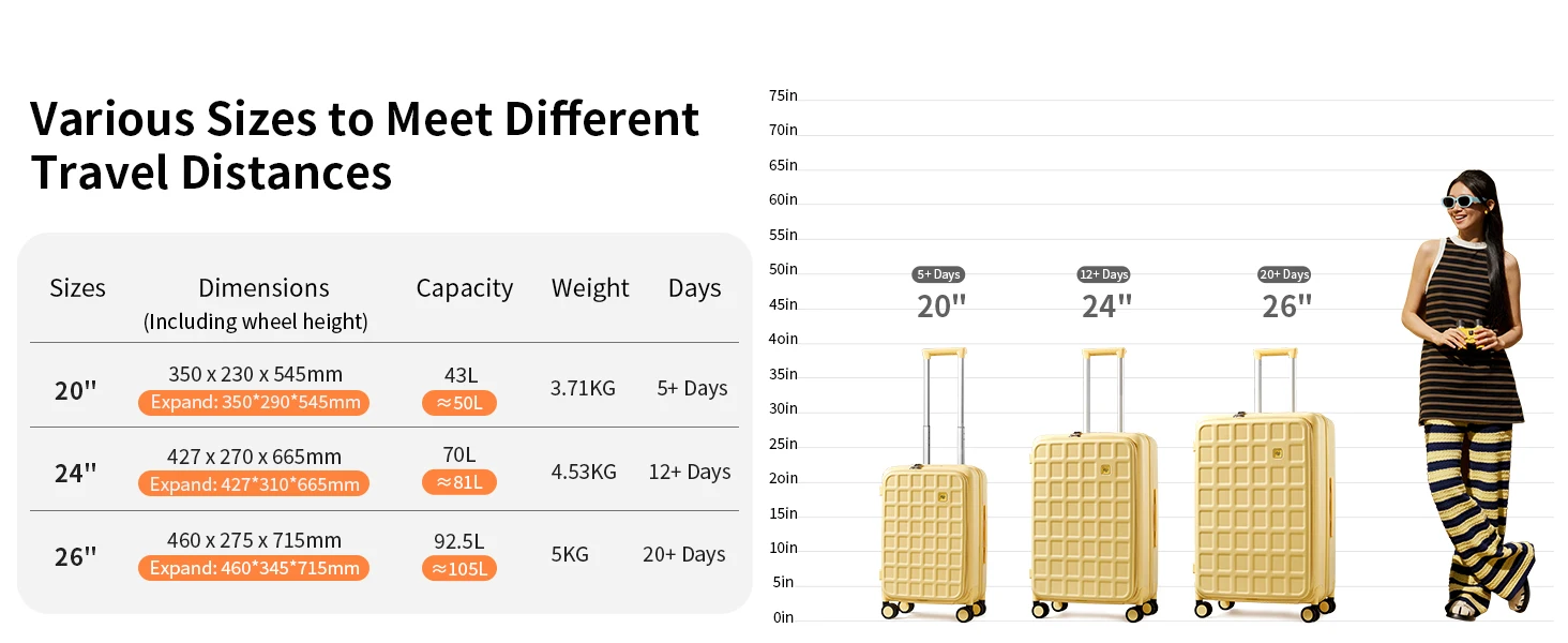 20 inches for Carry-On, 26 inches for Check-In: 20 inches fits Spirit/Frontier airlines; 24/26 inches for family trips or international travel.This luggage also makes a great wedding gift, vacation, birthday gift and Christmas gift!