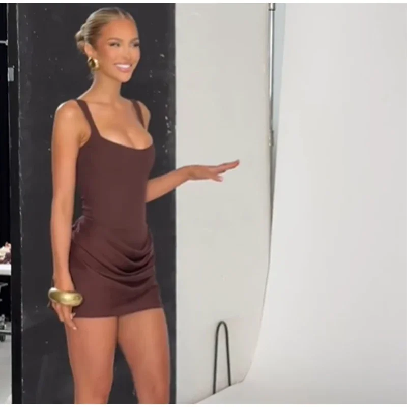 Solid Pleated Hem Sling Mini Dress Women Elegant U-neck Sleeveless Backless Bandage Slim Dresses Summer Evening Club Party Gown