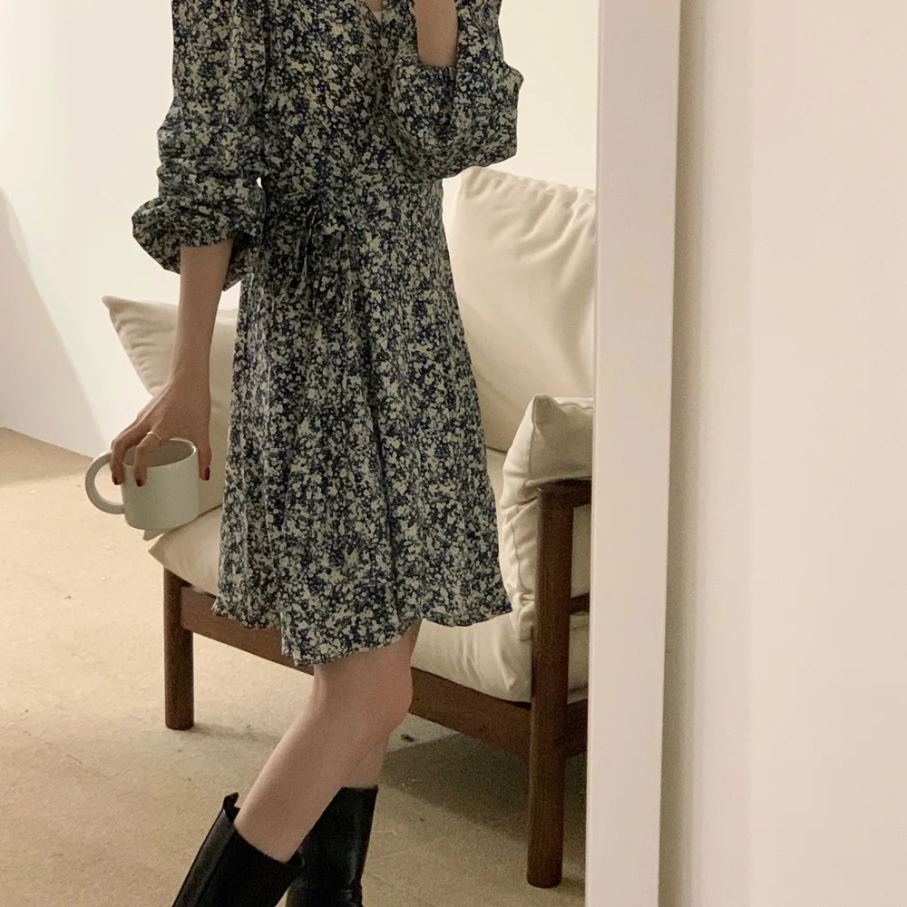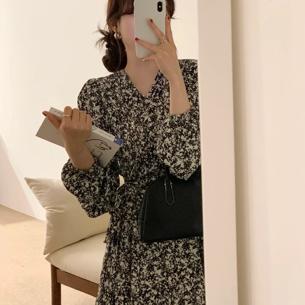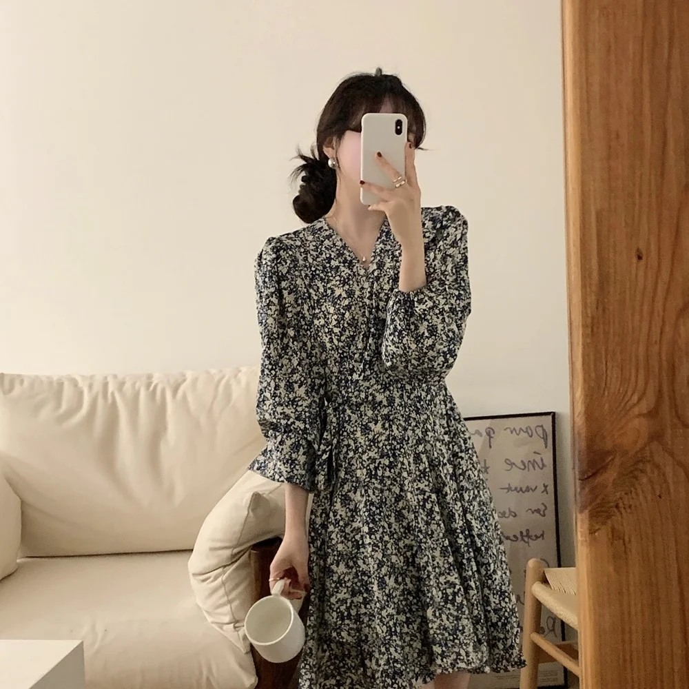 South korea Chic Autumn Retro Temperament V-neck Full Screen Floral Waist Hugging Slimming Long sleeve Small Dress Women