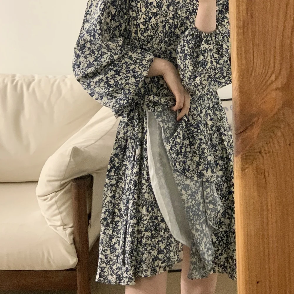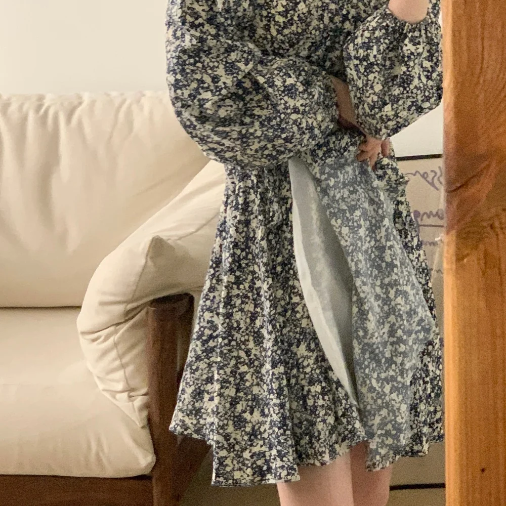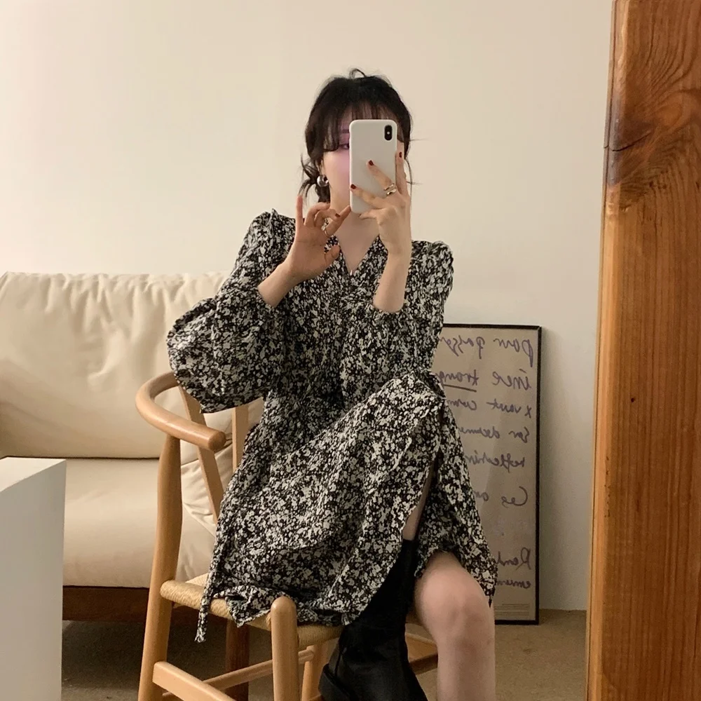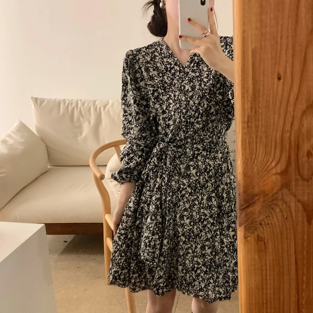 South korea Chic Autumn Retro Temperament V-neck Full Screen Floral Waist Hugging Slimming Long sleeve Small Dress Women