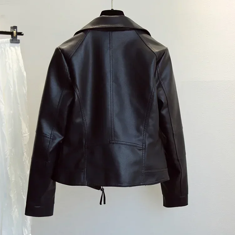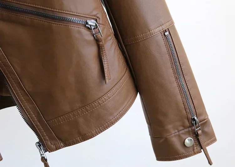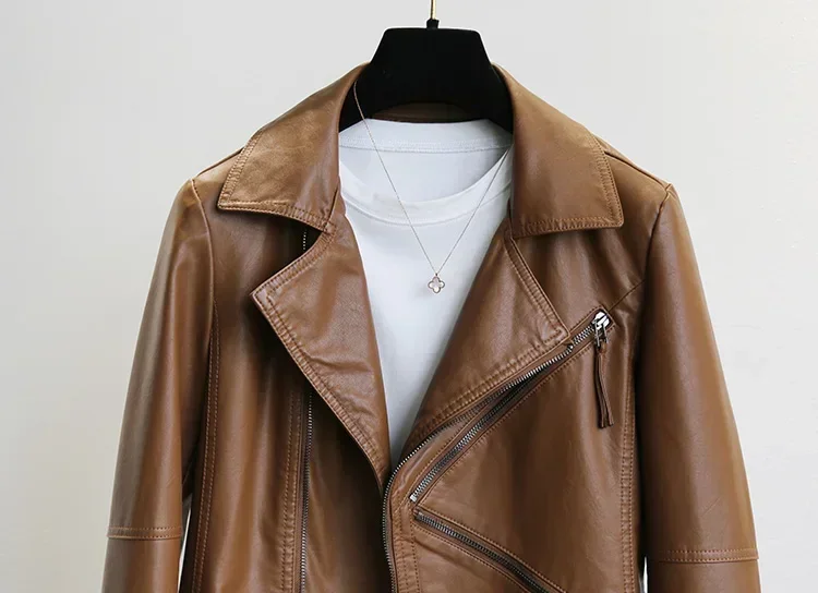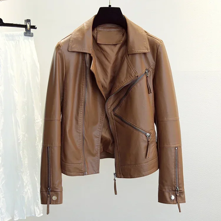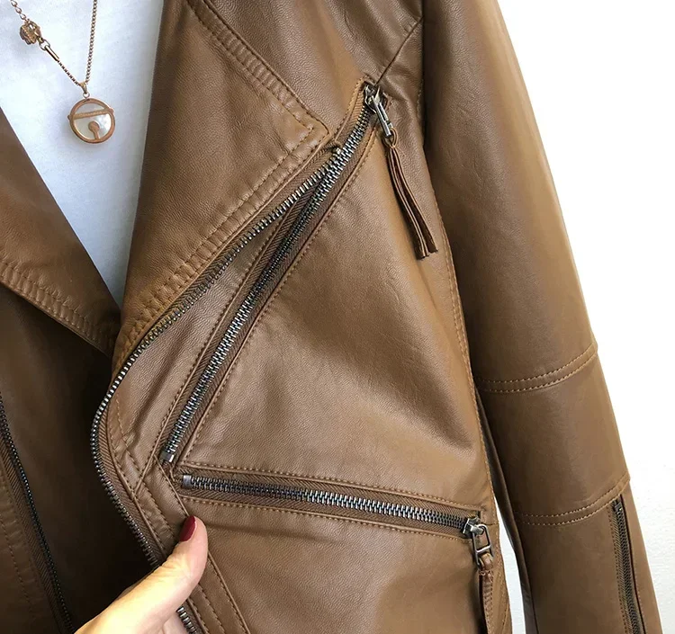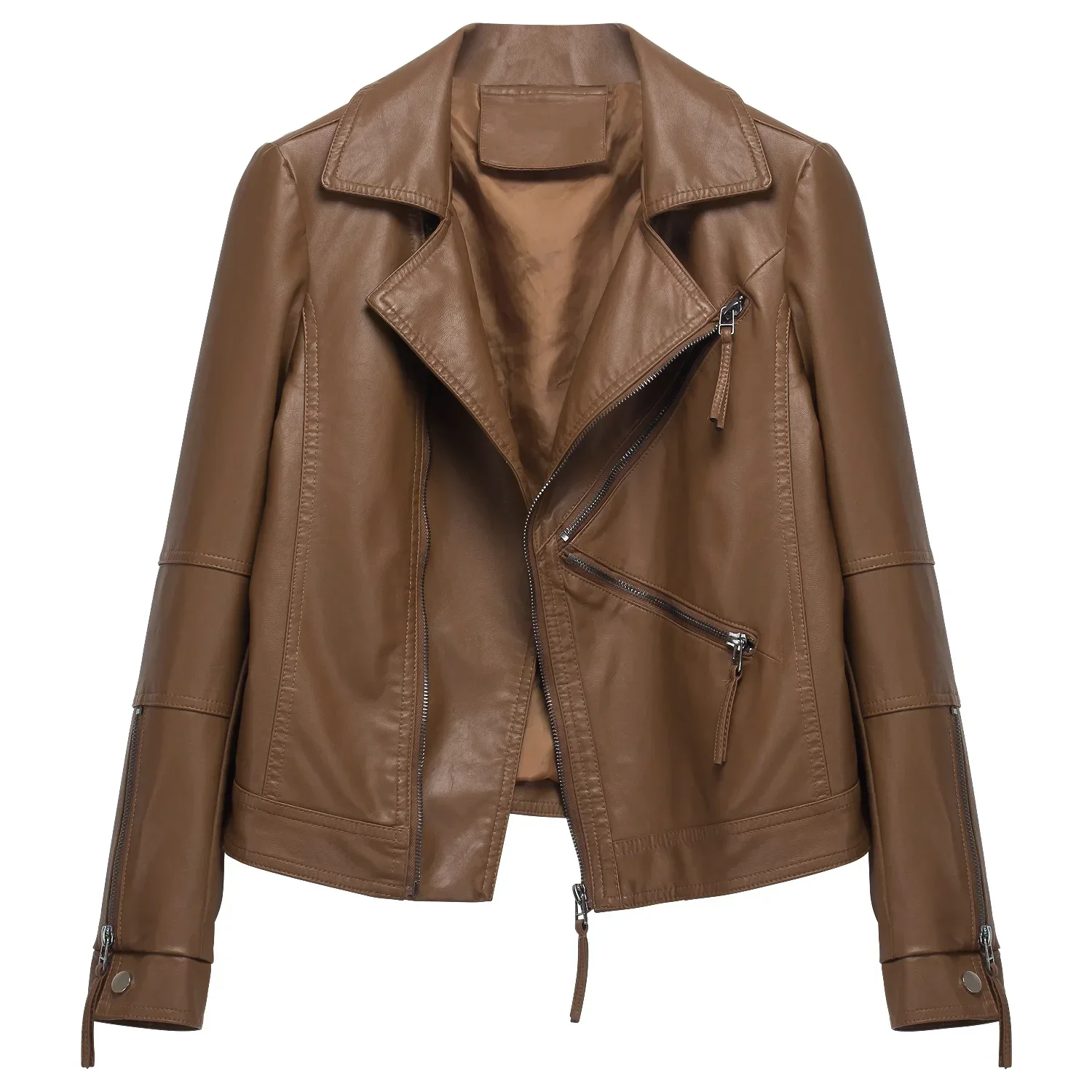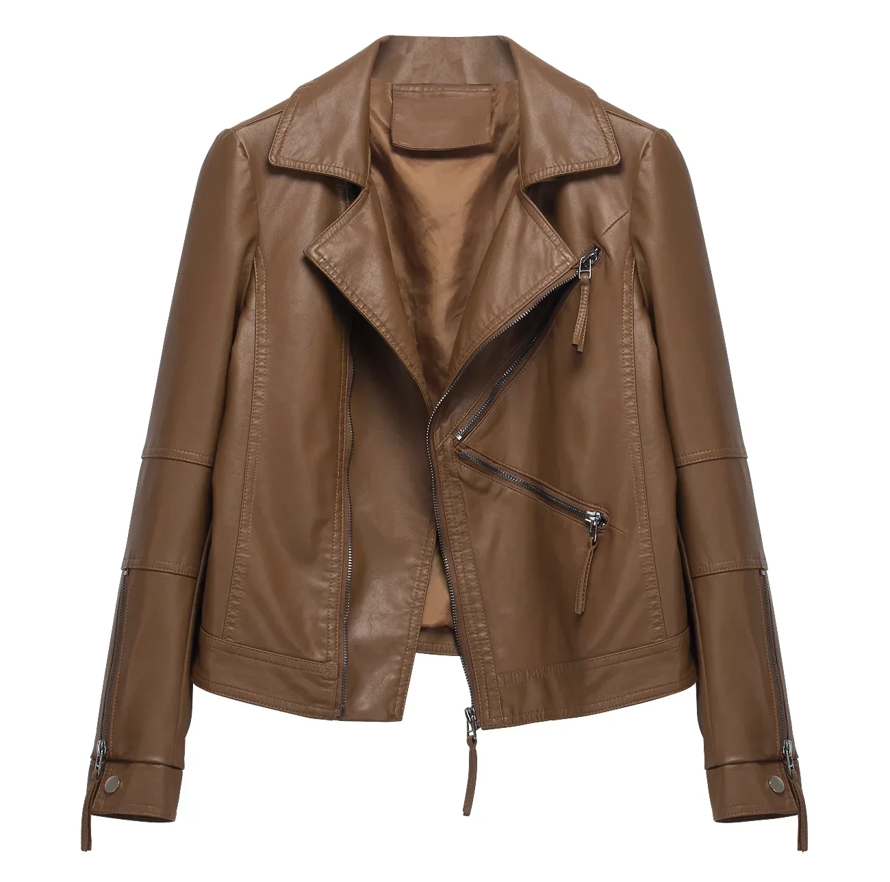 Spring Autumn Vintage Faux Leather Jacket Women Brown Moto Biker Leather Coats Casual Street Wear Zipper PU Basic Outwear