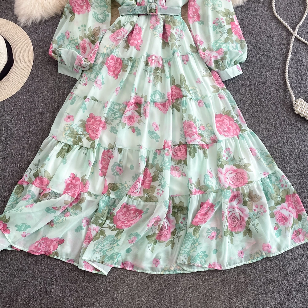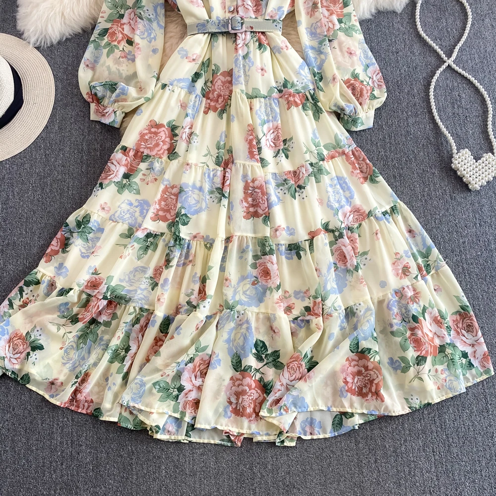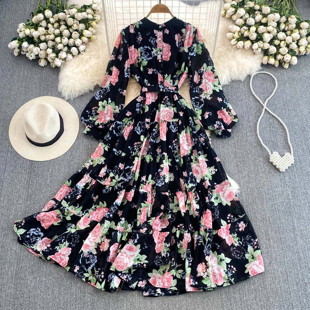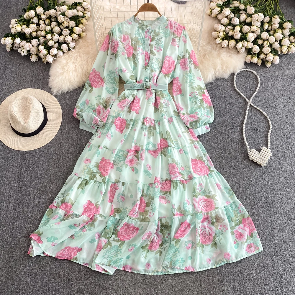 Spring Autumn Women Floral Chiffon Long Dress Vintage Purple/Pink/Black/Beige Stand Collar Single Breasted Maxi Robe Elegant New