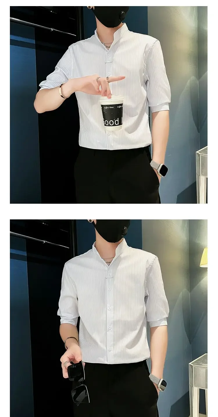 Striped Shirt 2025 New Men Summer Casual Thin Stand-up Collar Cardigan Five-sleeved Top