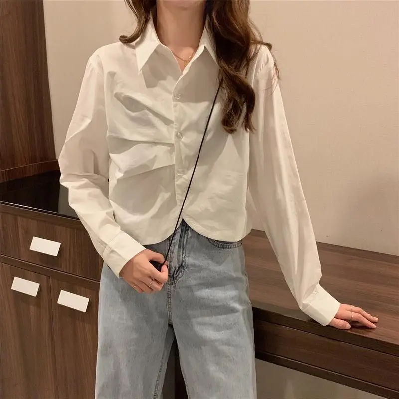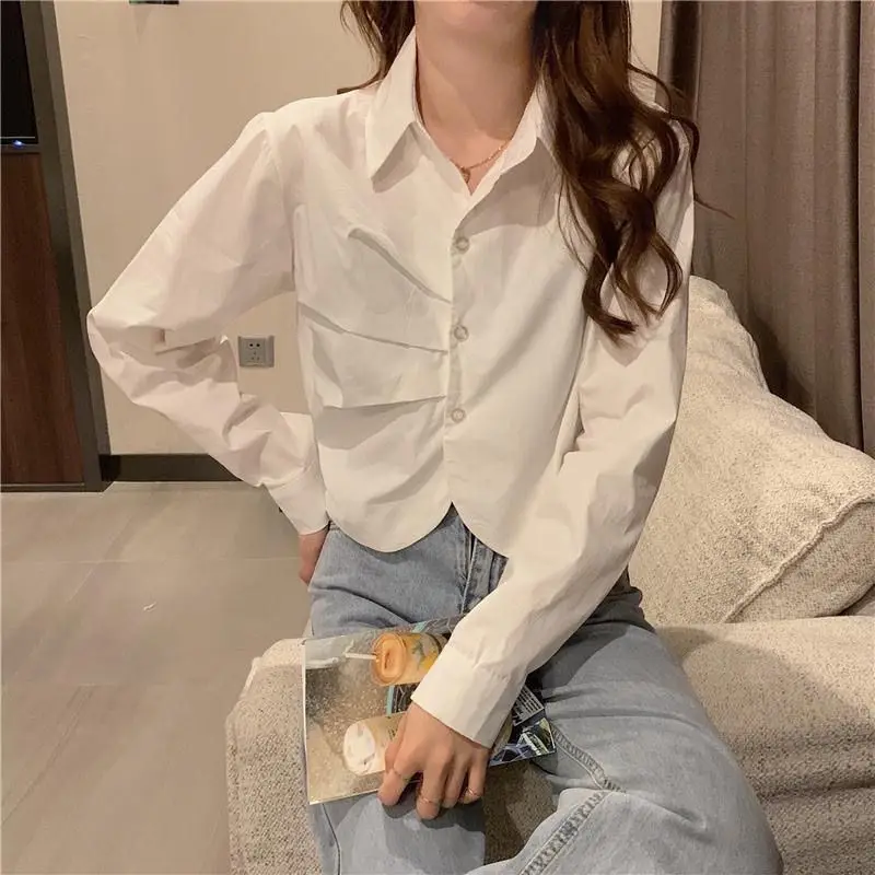 Striped Shirt Women's Design Niche Spring Autumn New Slim Versatile Pleated Long-sleeved Short Top