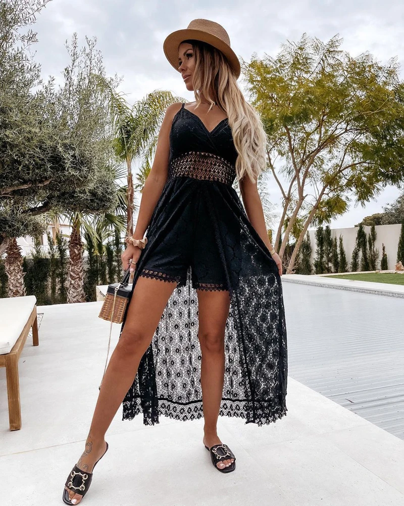 Summer V Neck Solid Color Lace Hollow-Out Sleeveless Sling Party Wear High Waist Rompers Holiday Casual White Women's Jumpsuit