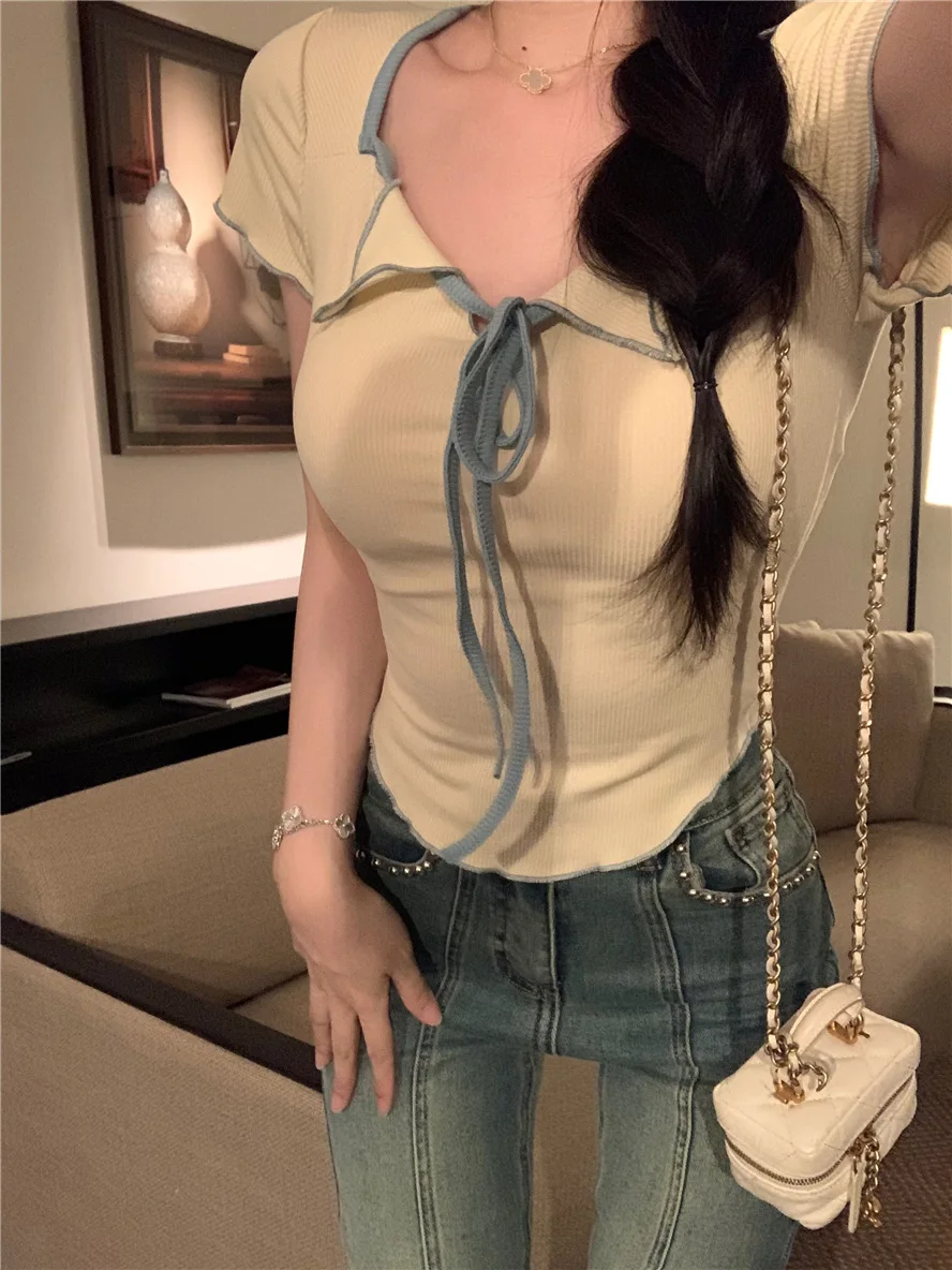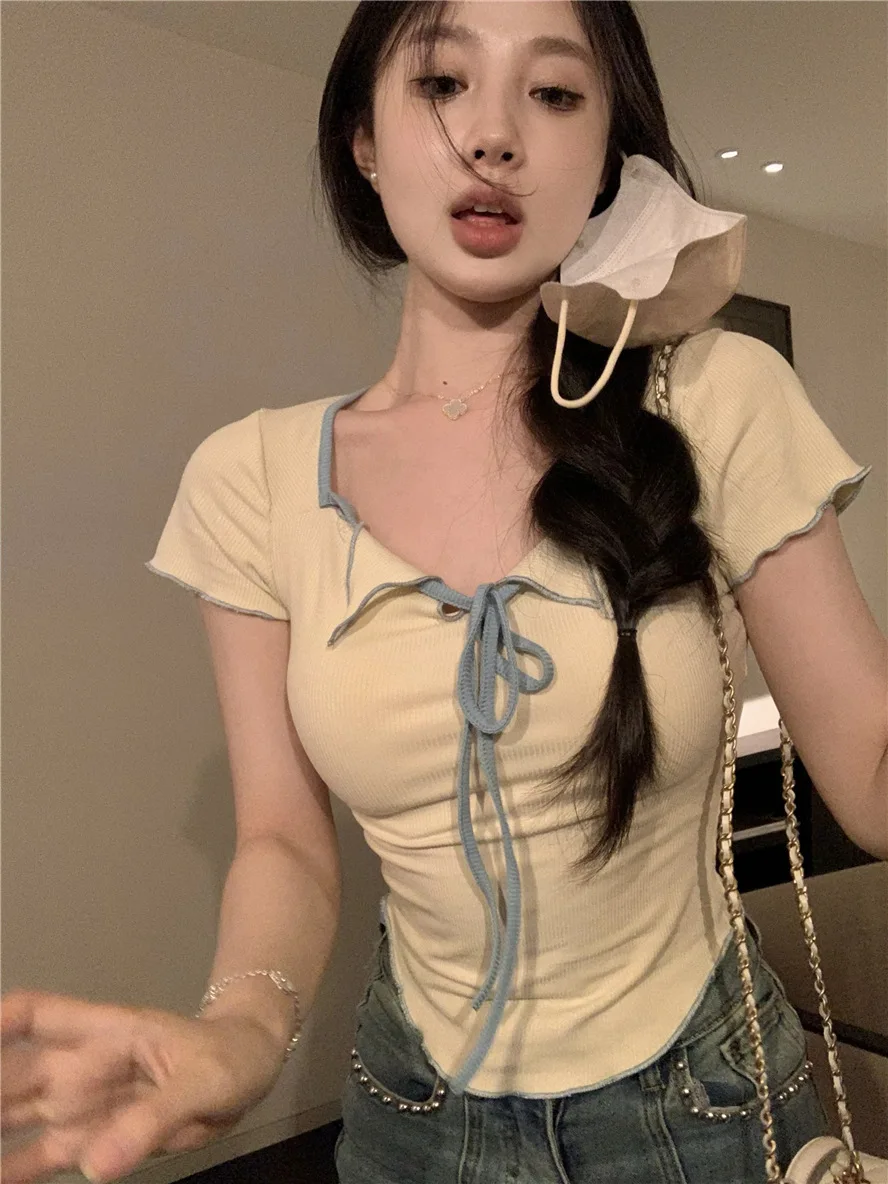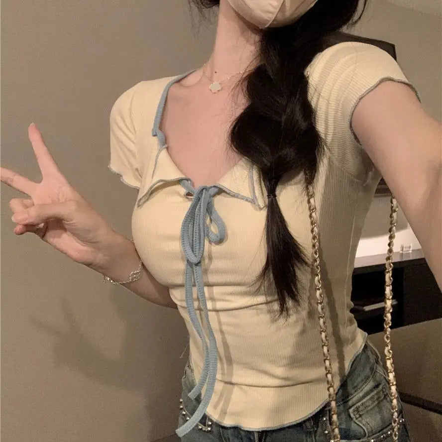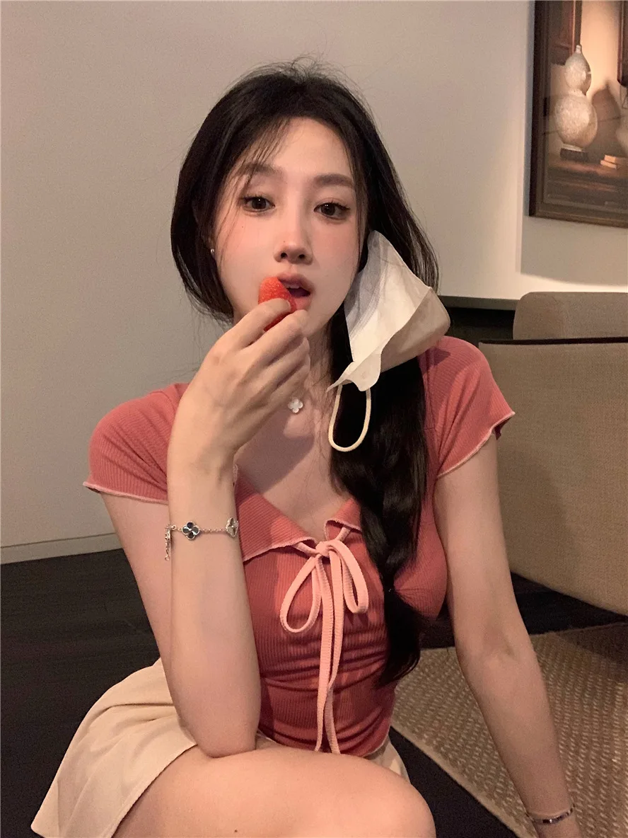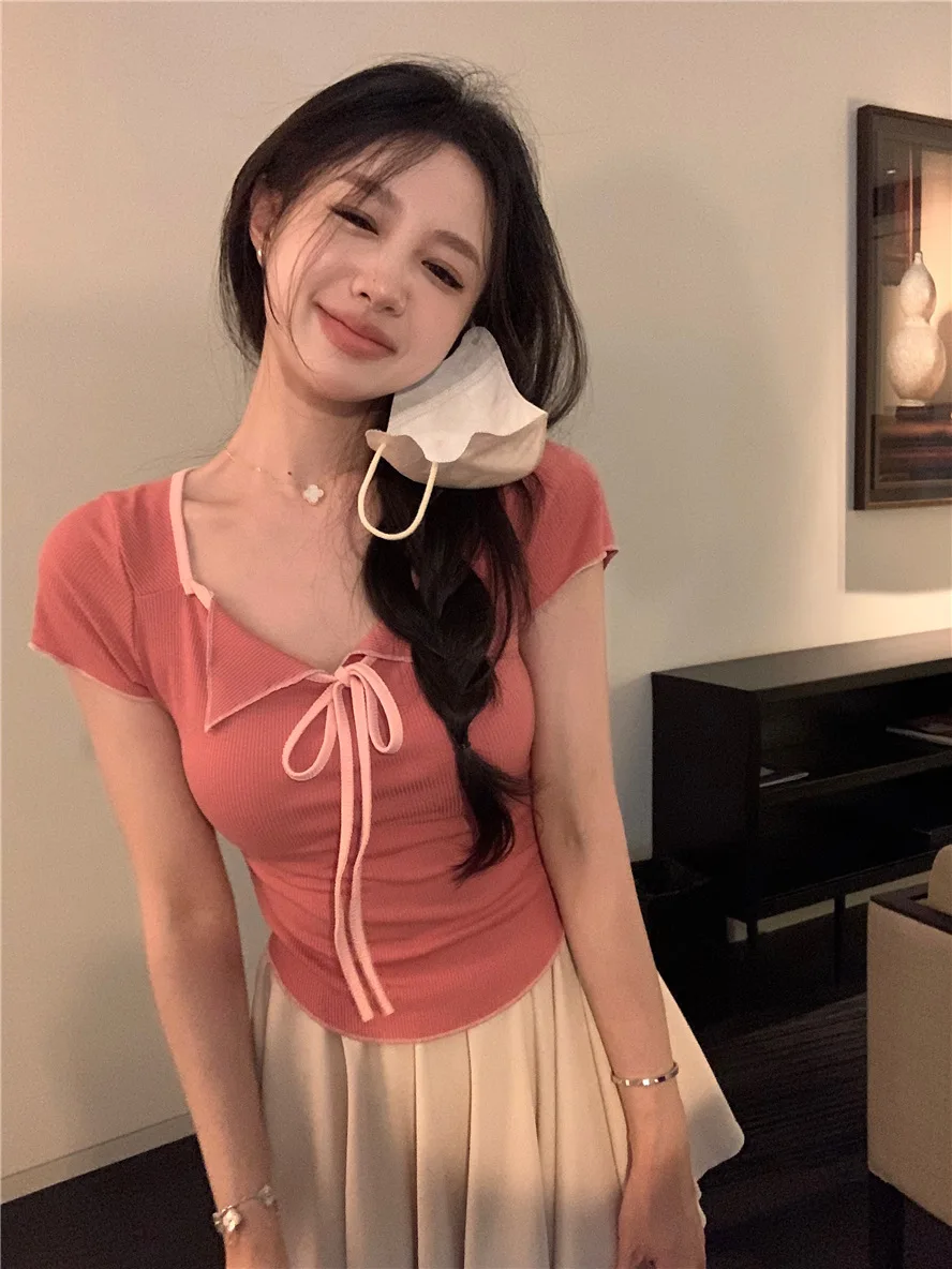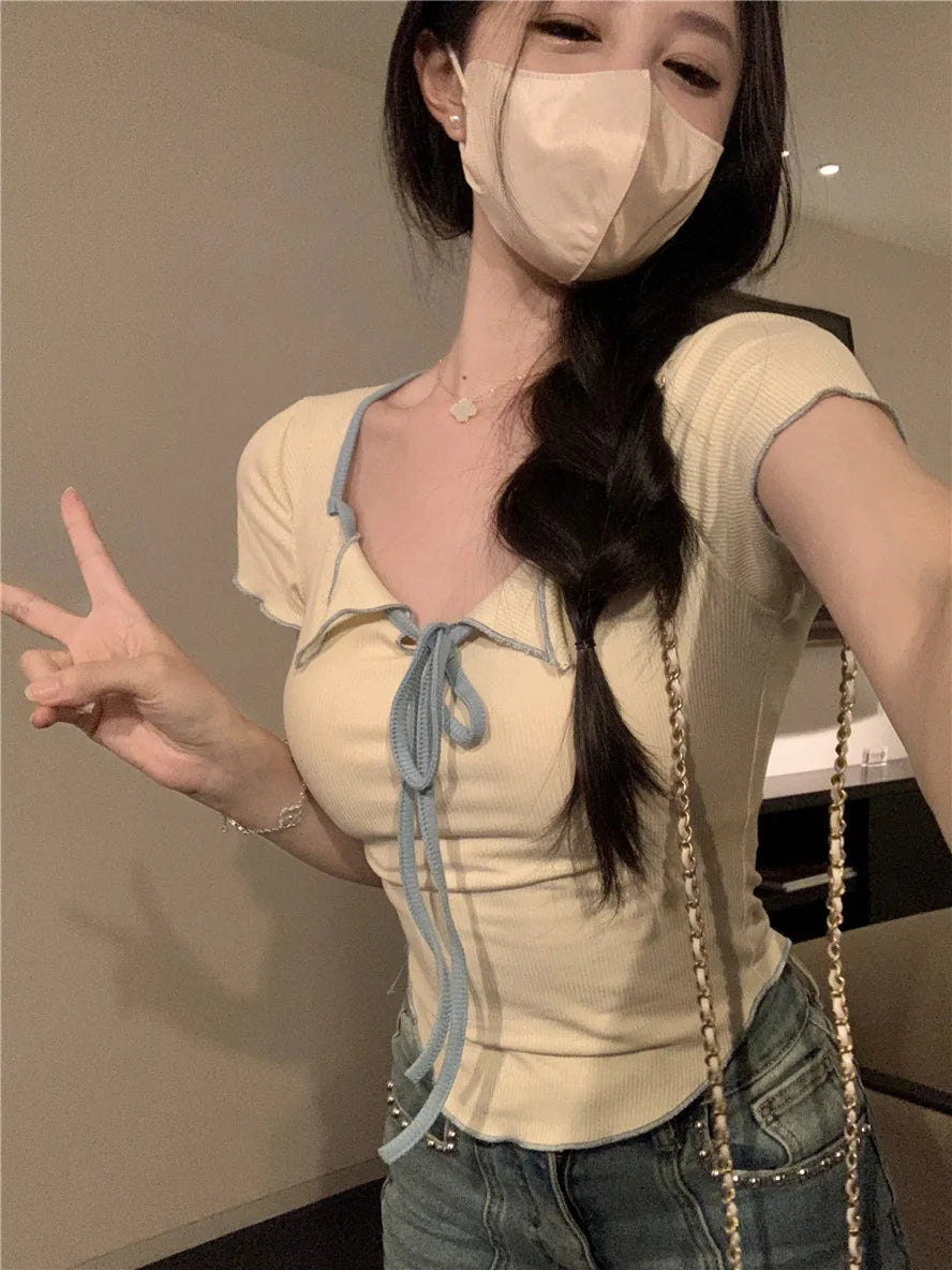 Sweet Spicy Girl Style Tie Straps V-neck Women's Knitted T-shirt Show Slim Figure Short Sleeved Tops Youth Elegant