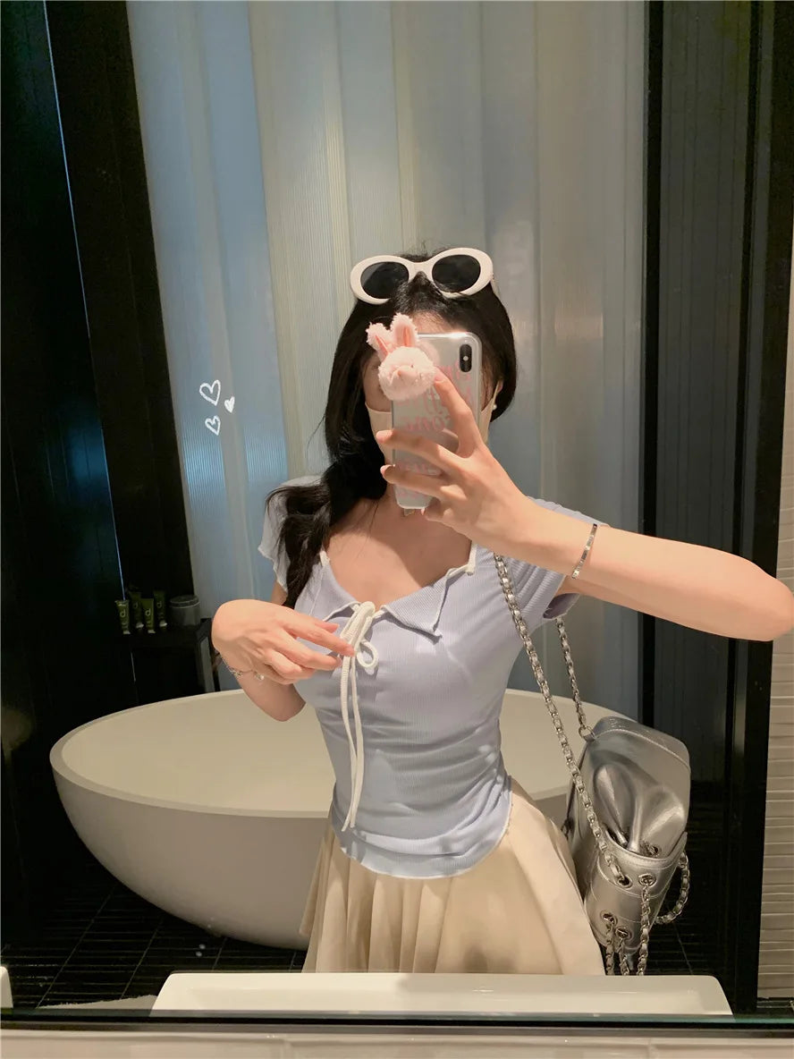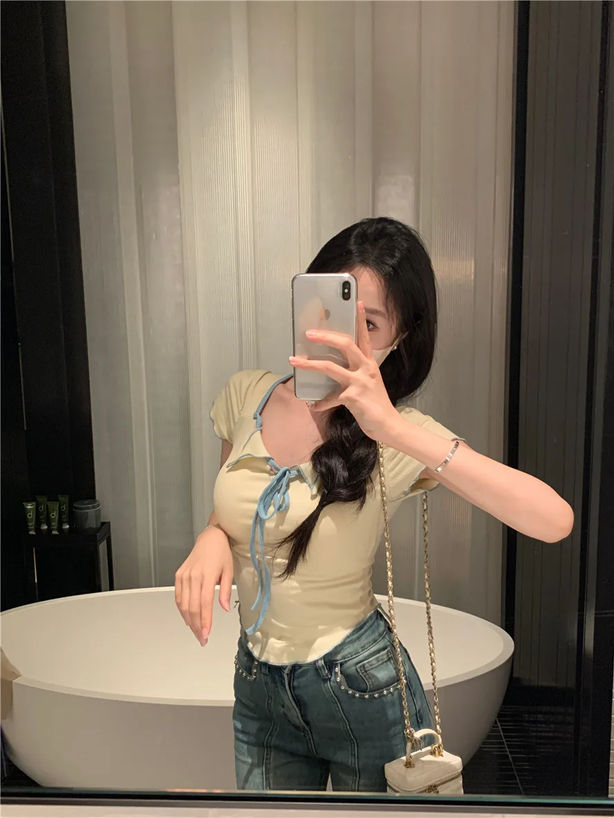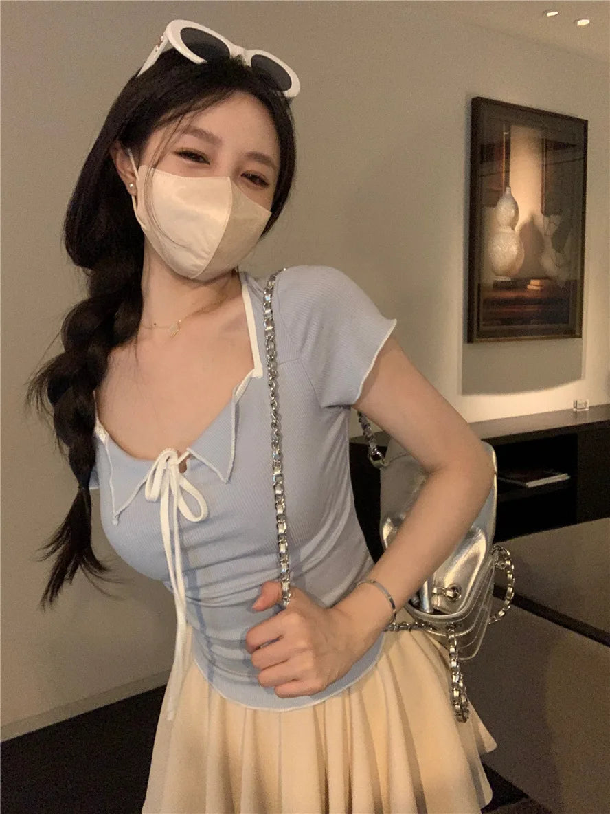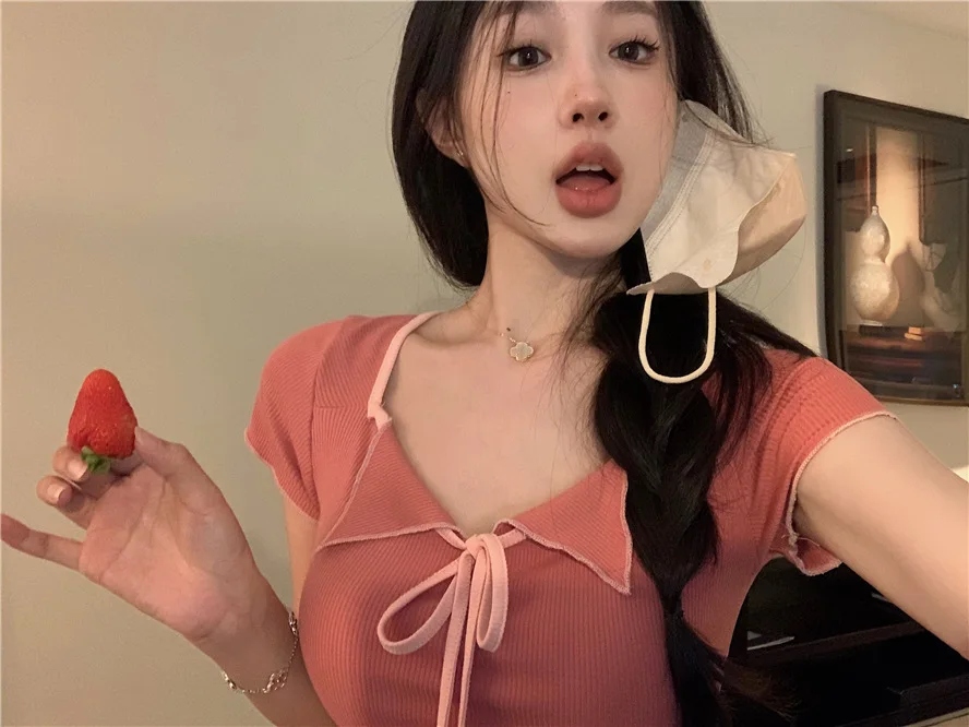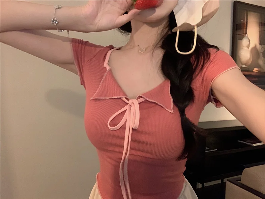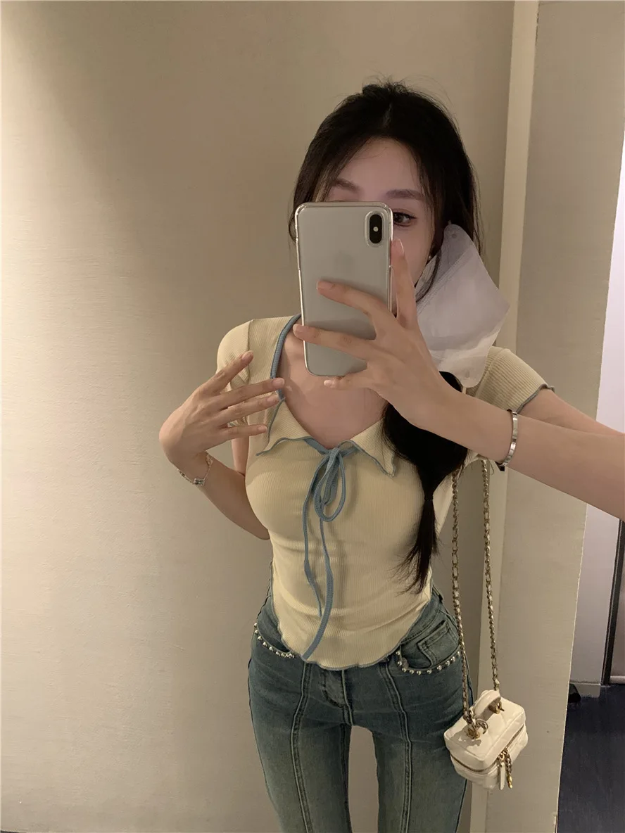 Sweet Spicy Girl Style Tie Straps V-neck Women's Knitted T-shirt Show Slim Figure Short Sleeved Tops Youth Elegant