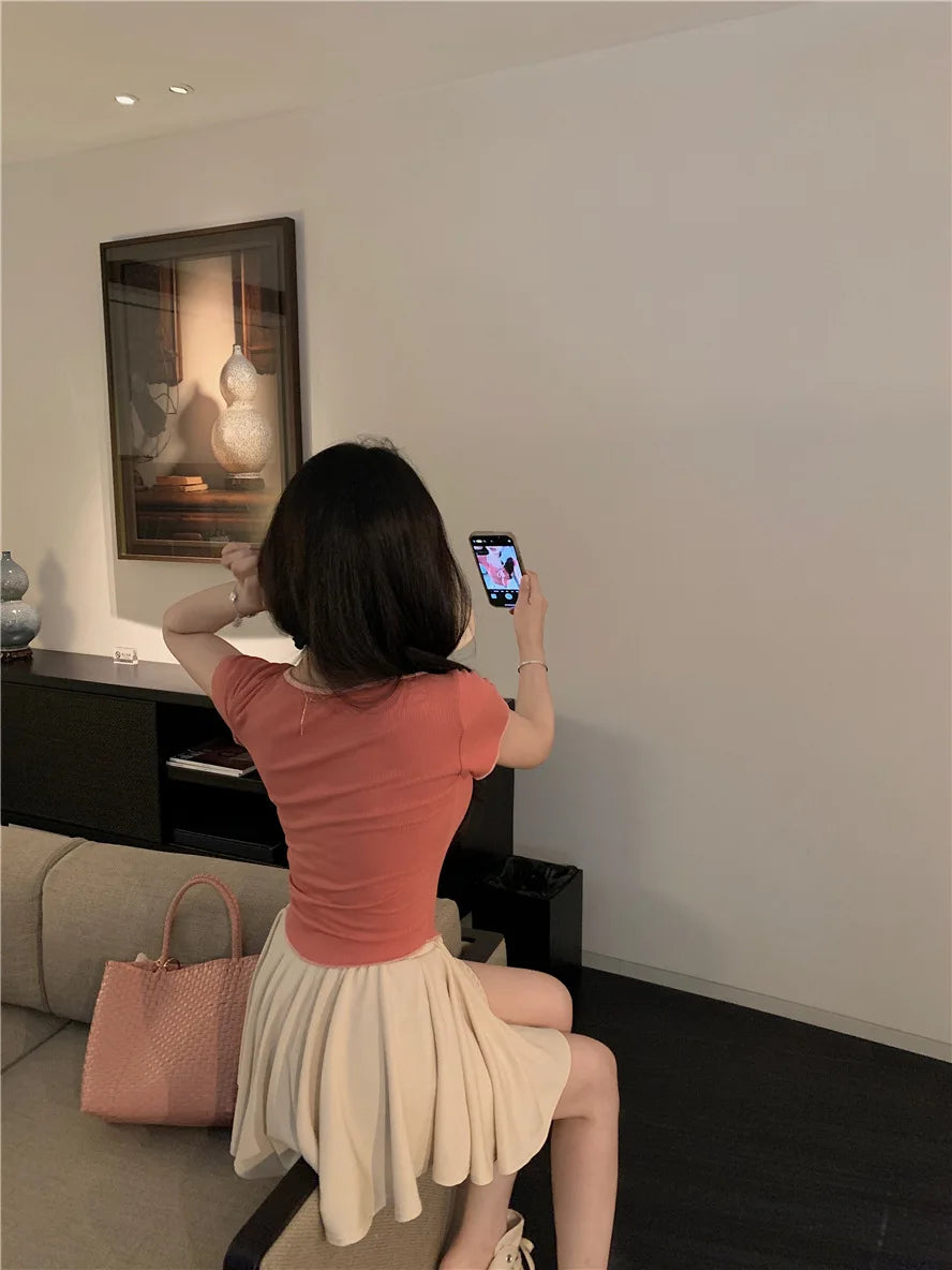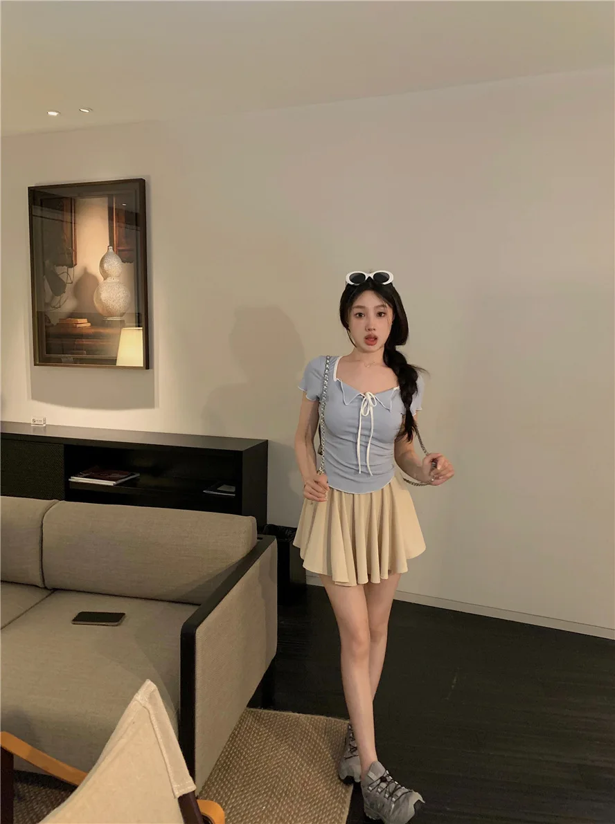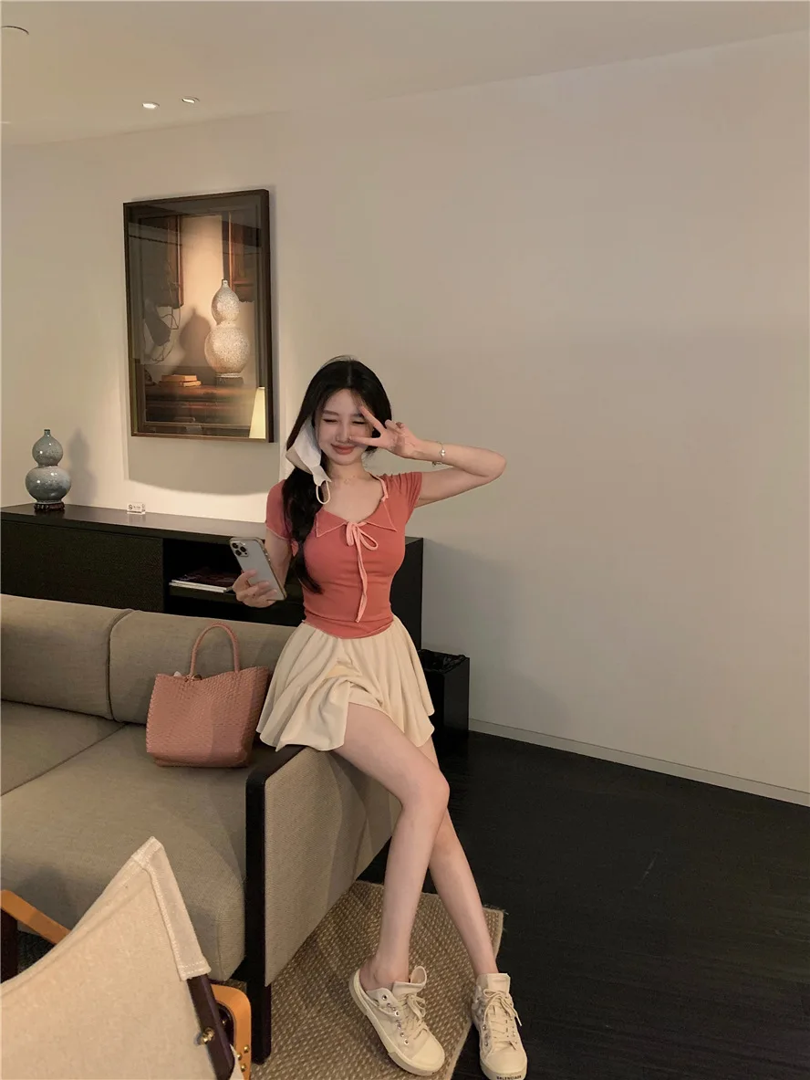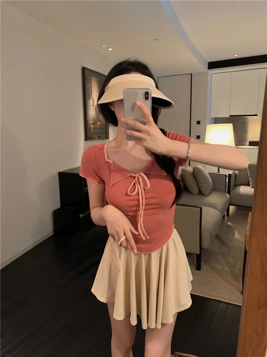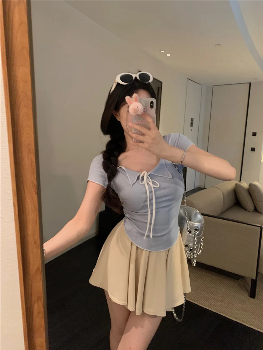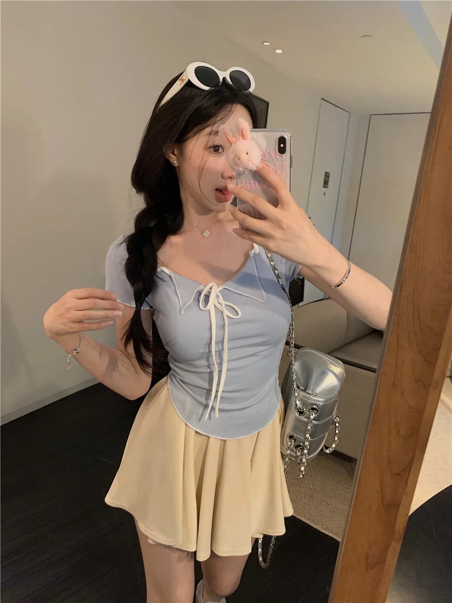 Sweet Spicy Girl Style Tie Straps V-neck Women's Knitted T-shirt Show Slim Figure Short Sleeved Tops Youth Elegant