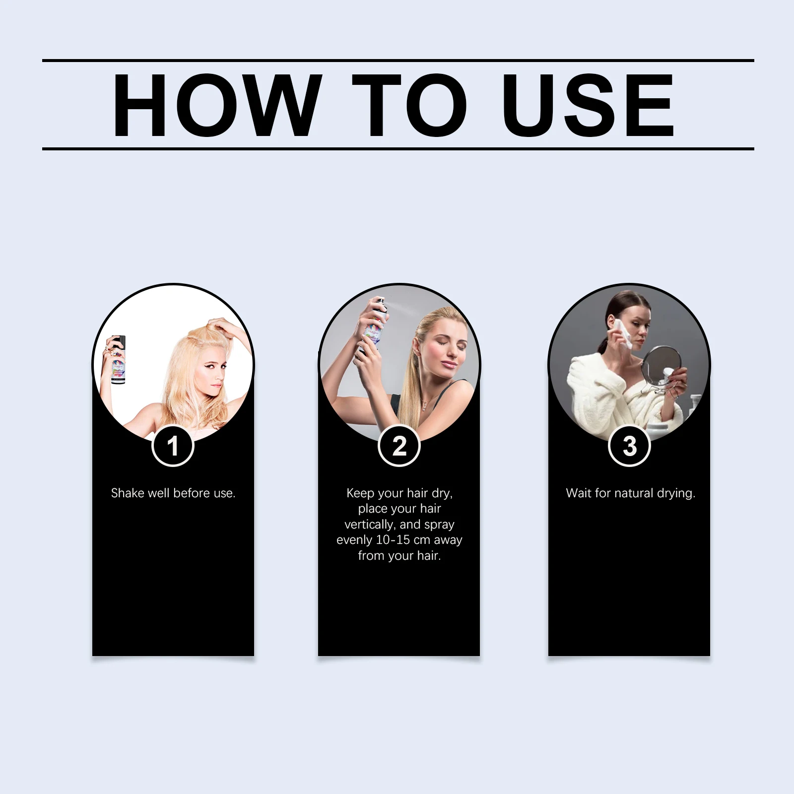 2. Keep your hair dry, place your hair vertically, and spray evenly 10-15 cm away from your hair.