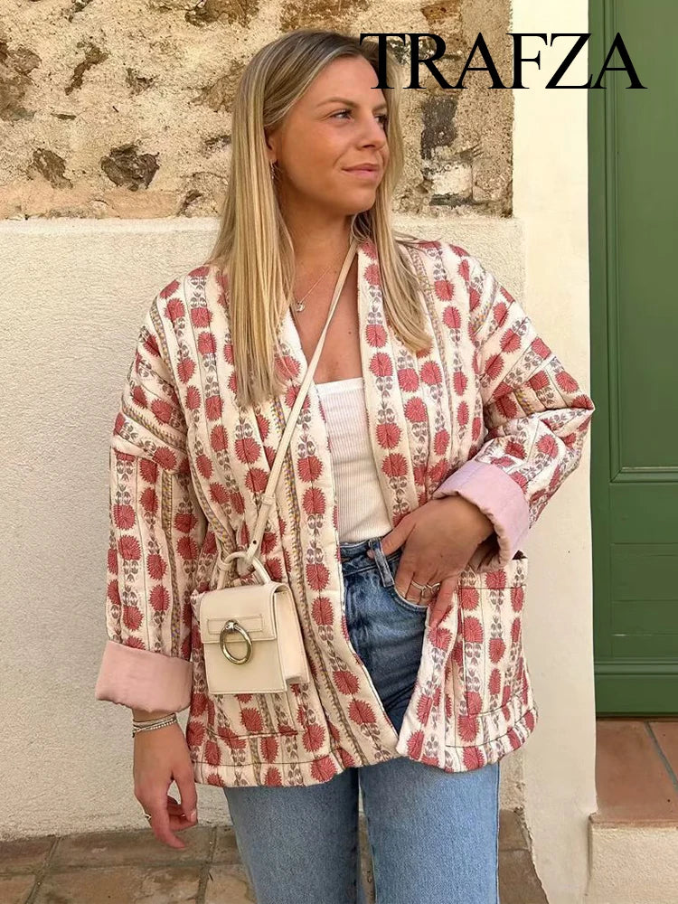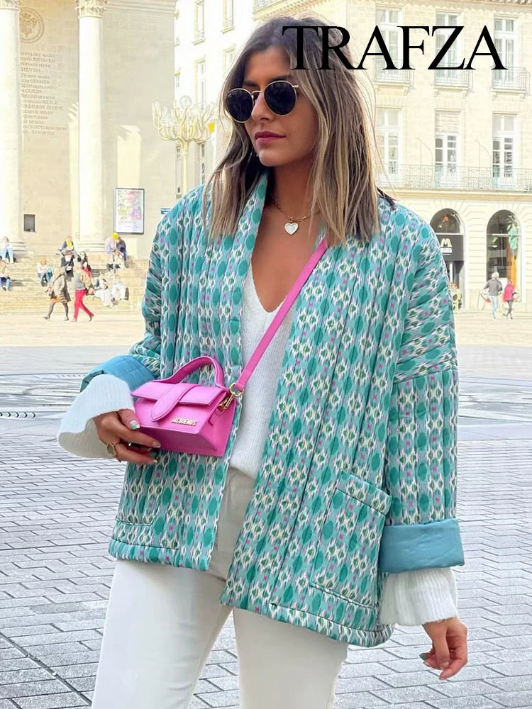 TRAFZA Vintage Patchwork Thick Cotton Jacket Women Loose Pocket Long Sleeve Autumn Winter Jacket Female O-Neck Ladies Outwear