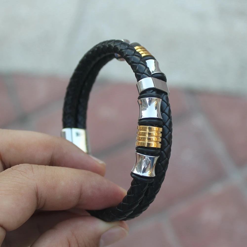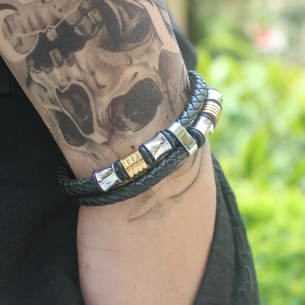 TYO Vintage Stainless Steel Wire Leather Male Bracelets Bangles For Men Double Layer Geometric Pattern Combination Bracelets