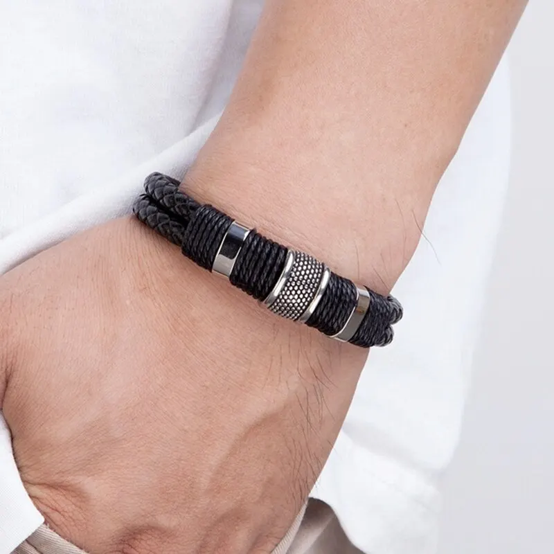 Vintage Woven Leather Rope Wrap Bracelets For Men Classic Stainless Steel Bangles Bracelets Punk Wristband Jewelry Male Gifts