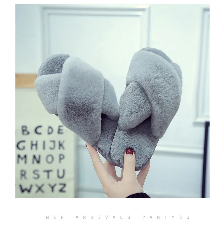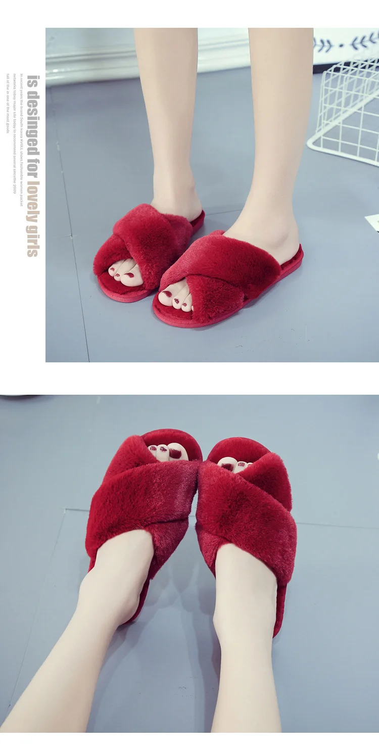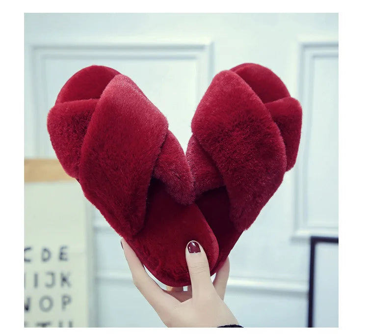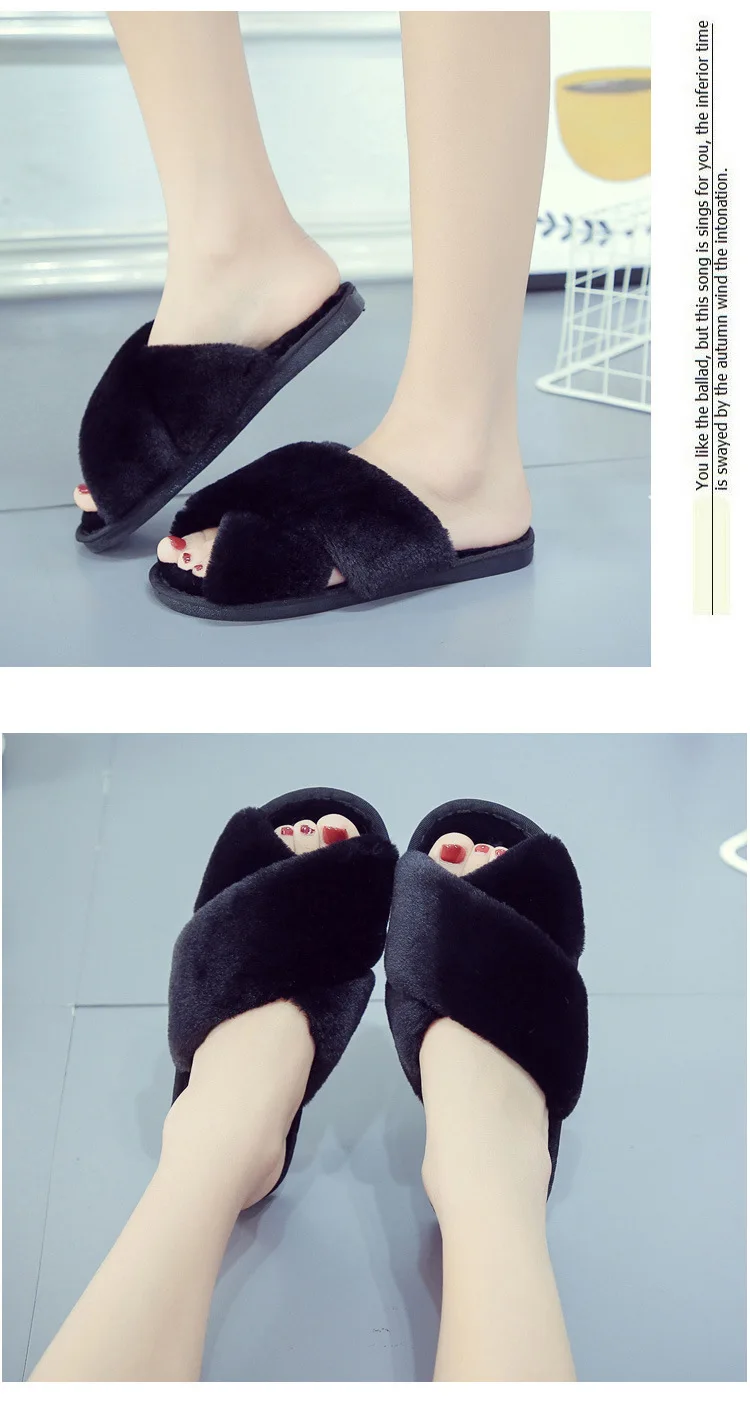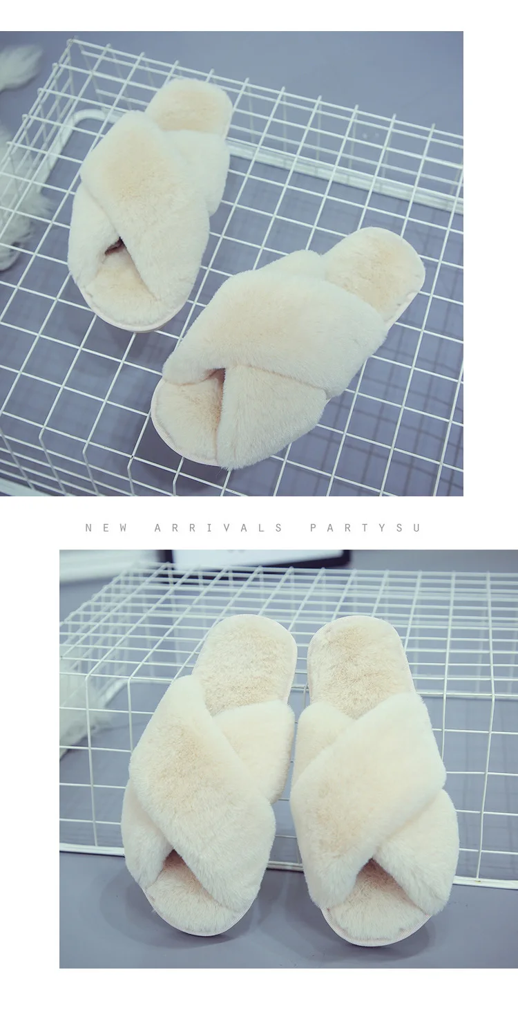 Warm Fluffy Slippers Women's Plush Slippers Comfortable Faux Fur Cross Indoor Floor Slippers Flat Soft Fur Shoes Ladies Women