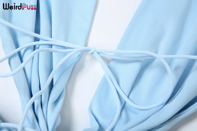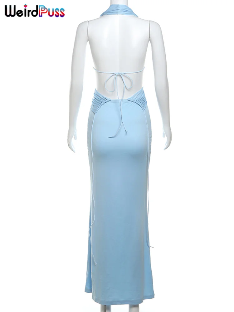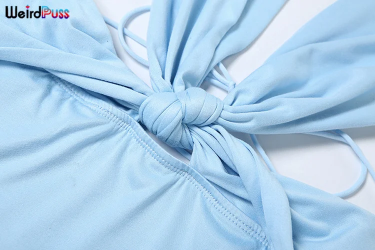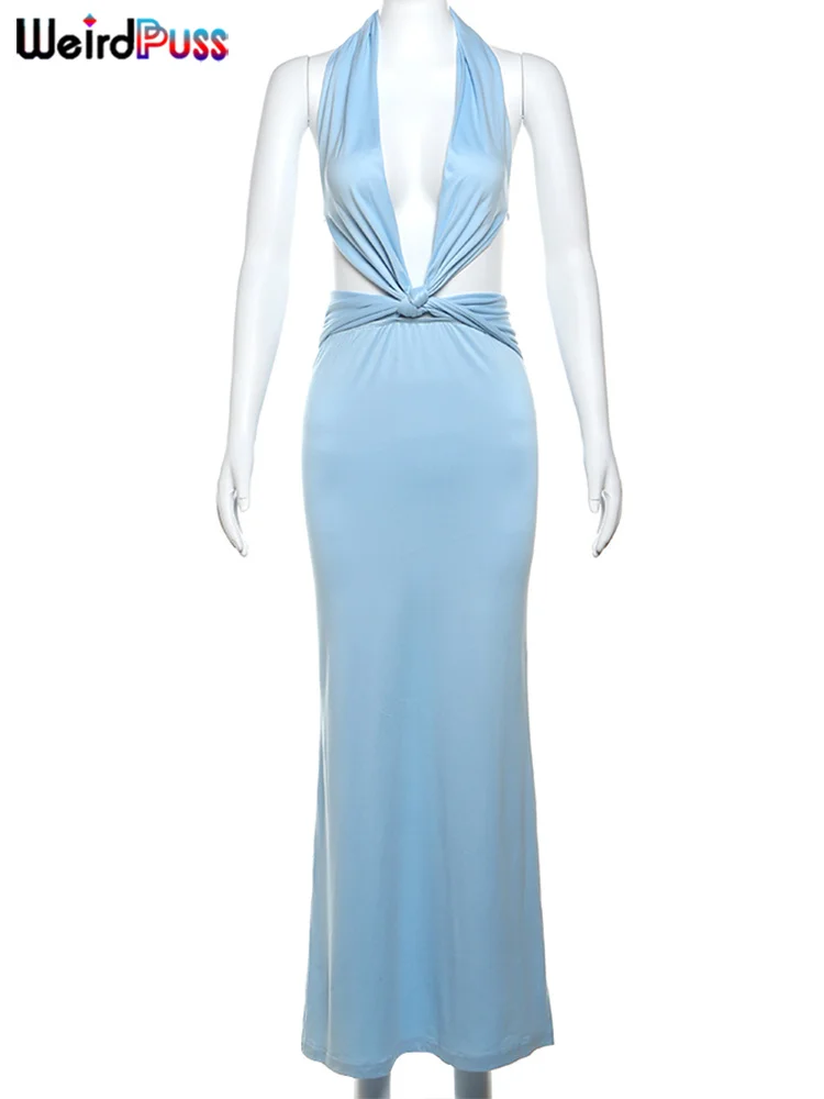 Weird Puss Knot Halter Dress Woman Summer Sexy Solid Backless Straps Ruffles Deep V-Neck Bodyshape Party Elegant Skinny Vestidos