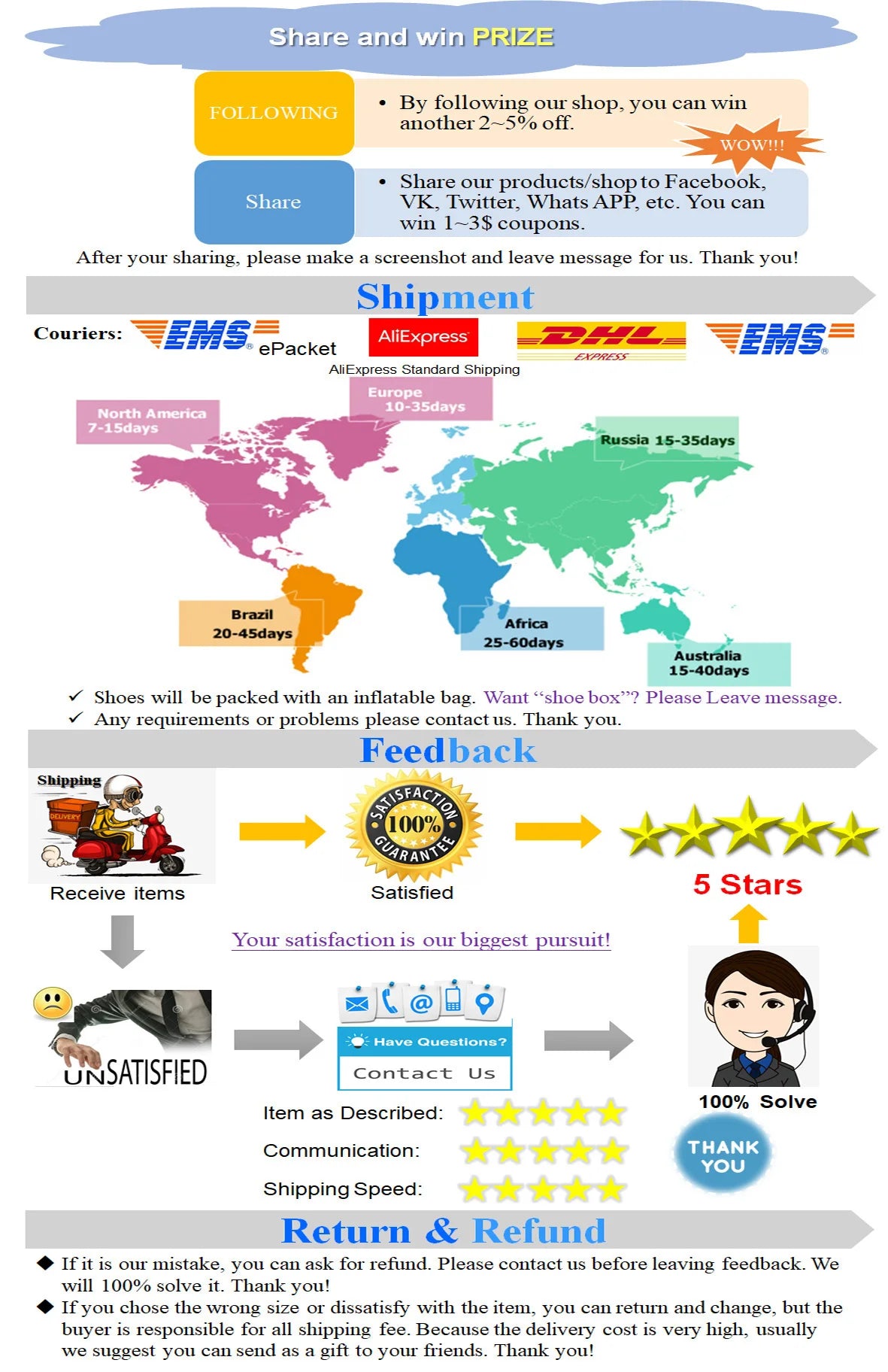 -Packaging is without any shoebox due to expensive shipping fee, if you insist on packing with a box,please contact our customer service and pay US$ 3/pair to get a box.