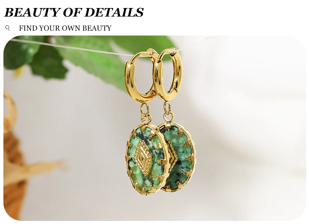 WILD & FREE 18K Gold Plated Natural Stone Stainless Steel Drop Earrings for Women Green African Turquoise Charm Vintage Jewelry