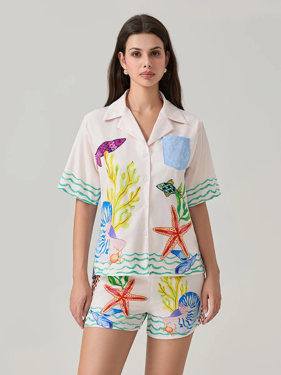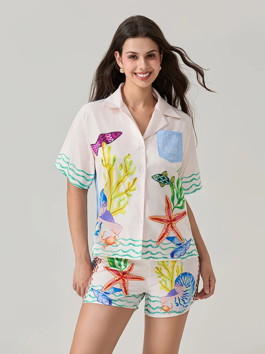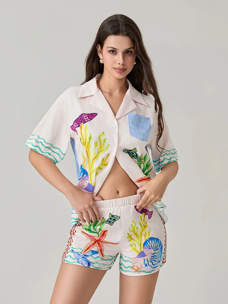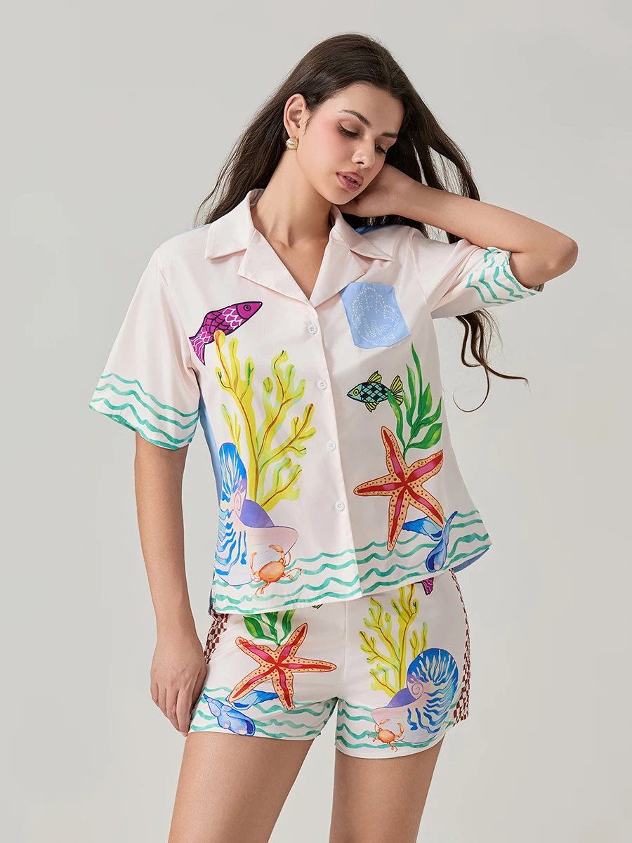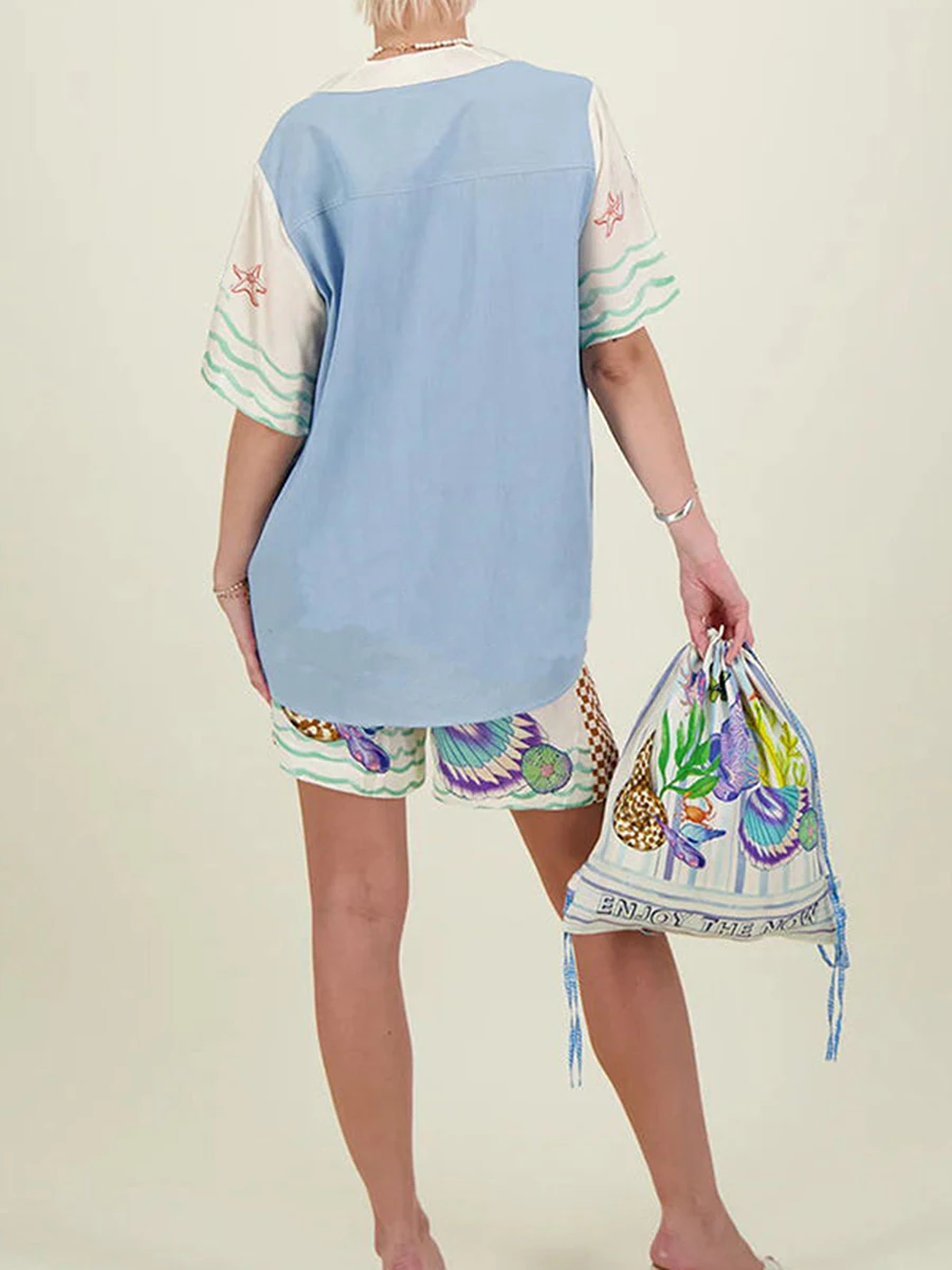Women 2 Piece Outfits Ocean Print Button Short Sleeve T-Shirt and Elastic Shorts Club Streetwear Fashion Clothes
