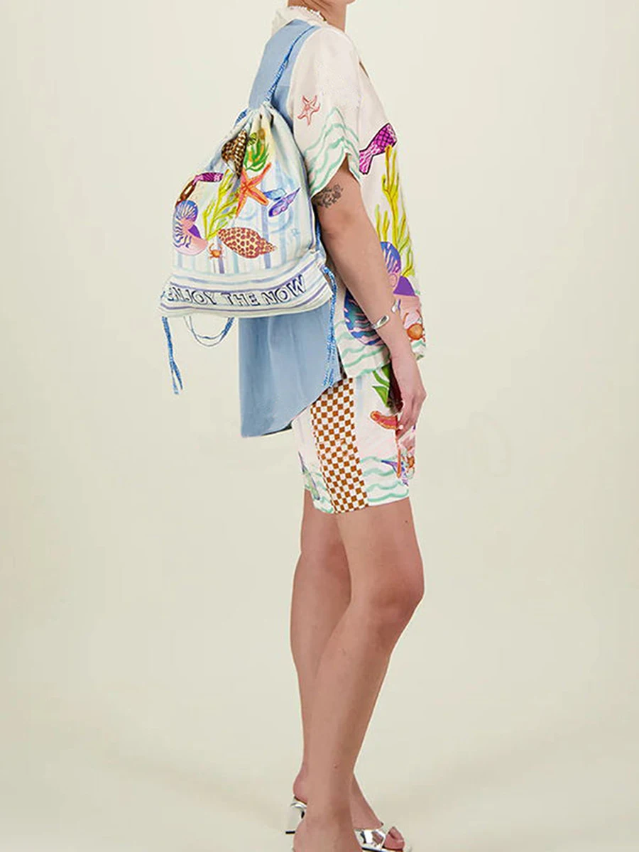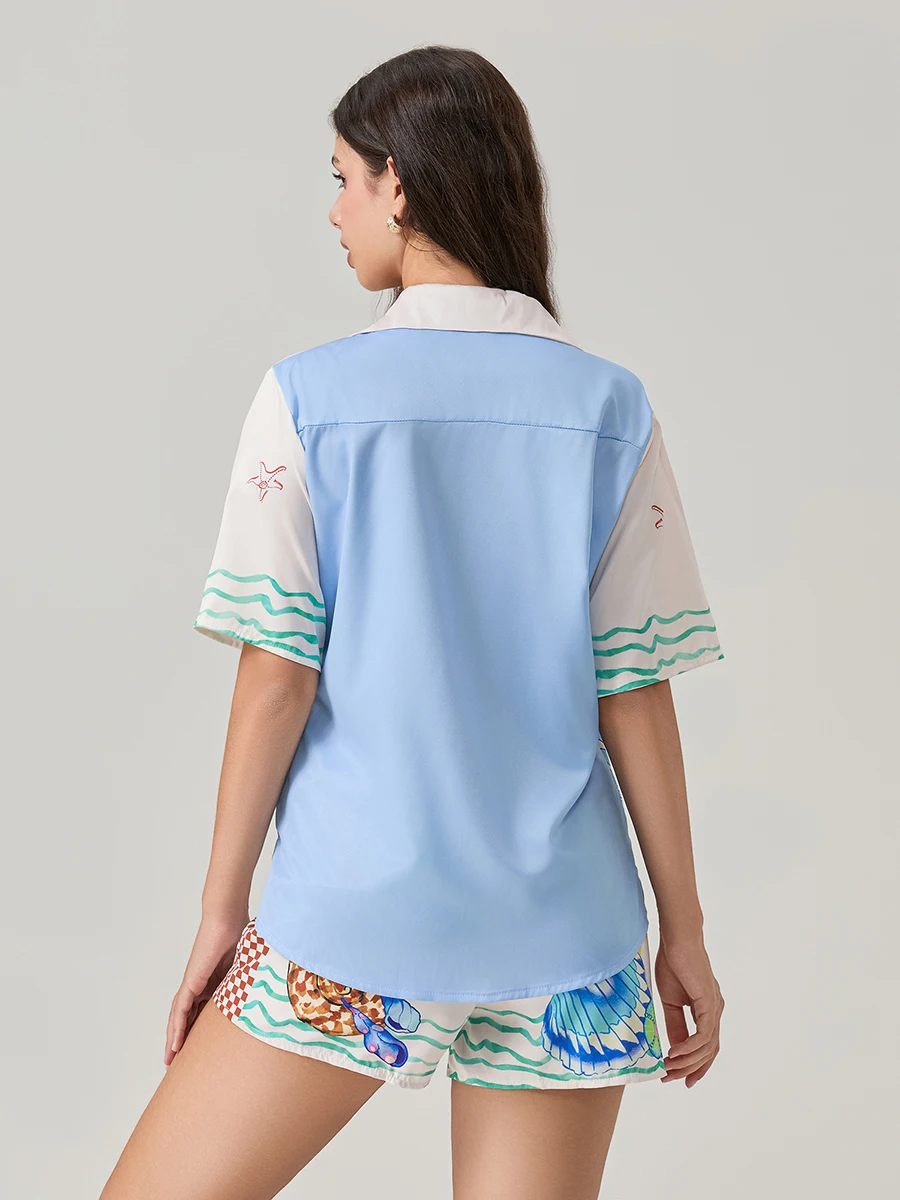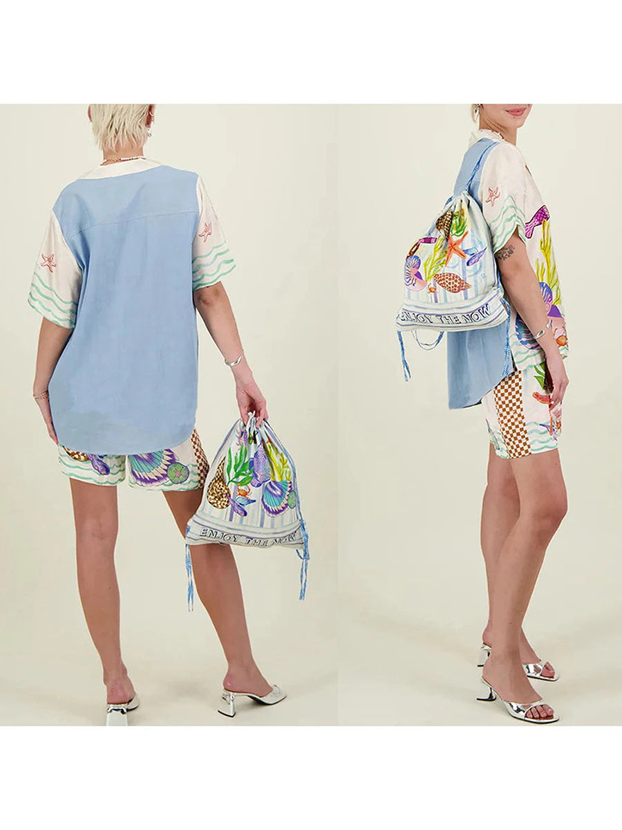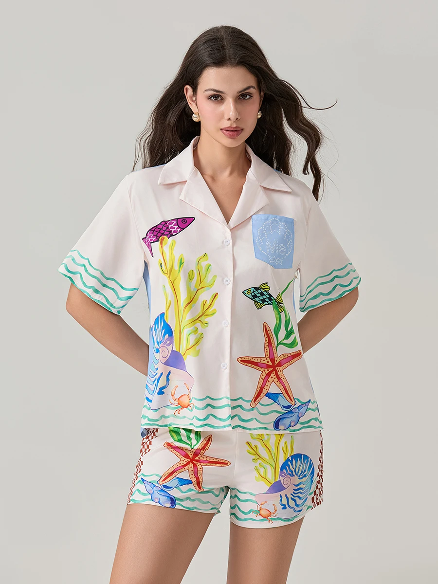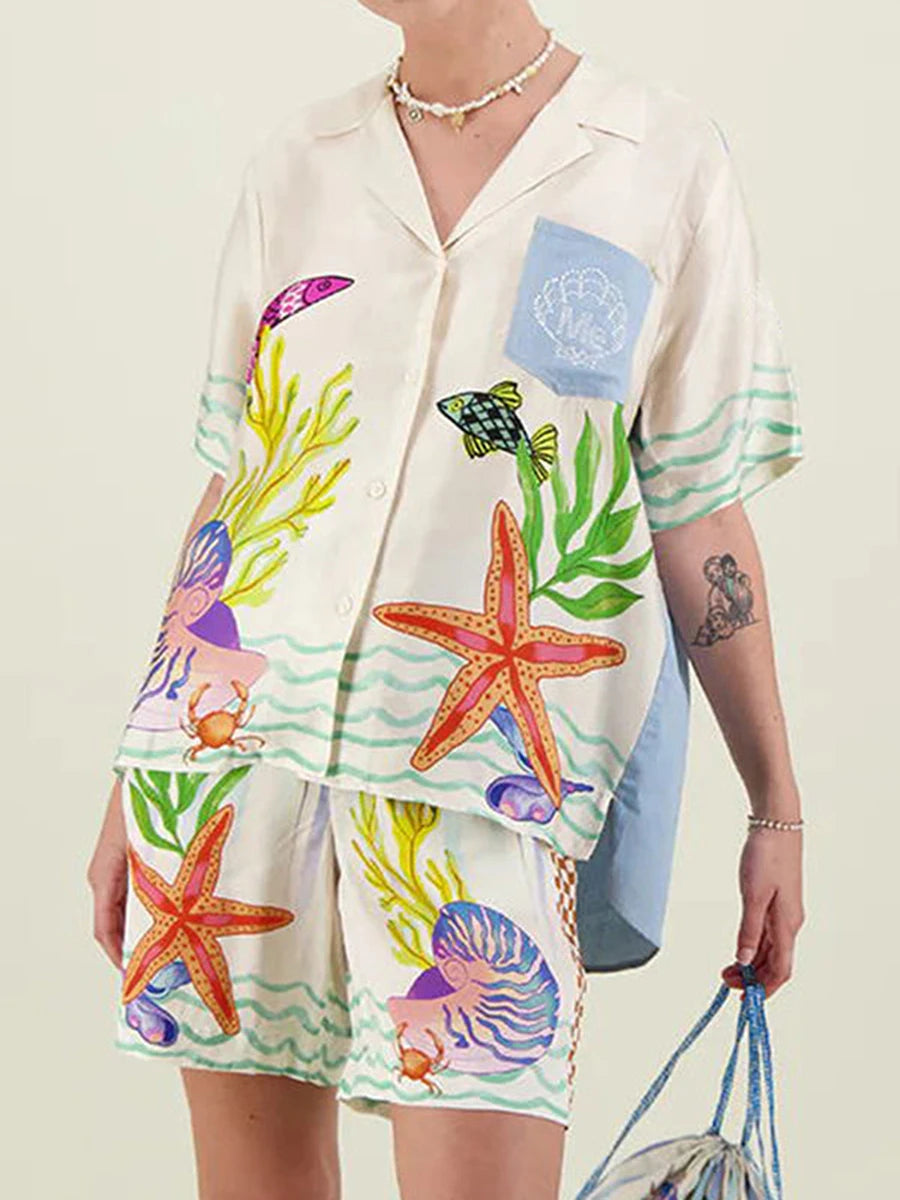 Ocean print, loose casual style, women's t-shirt with short sleeves, front button closure and turn-down collar, 1 chest pocket design. Women's shorts with elastic waist design, easy to fit, a perfect combination of comfort and fashion.