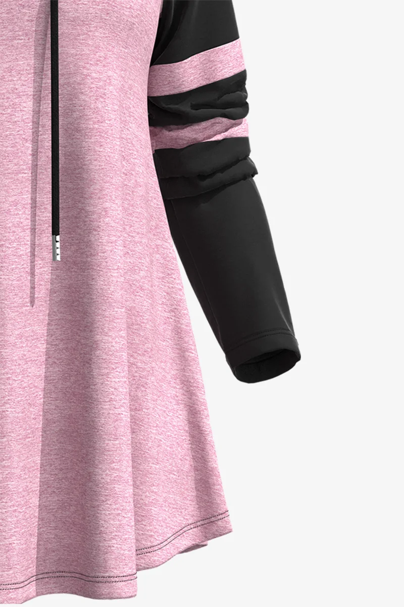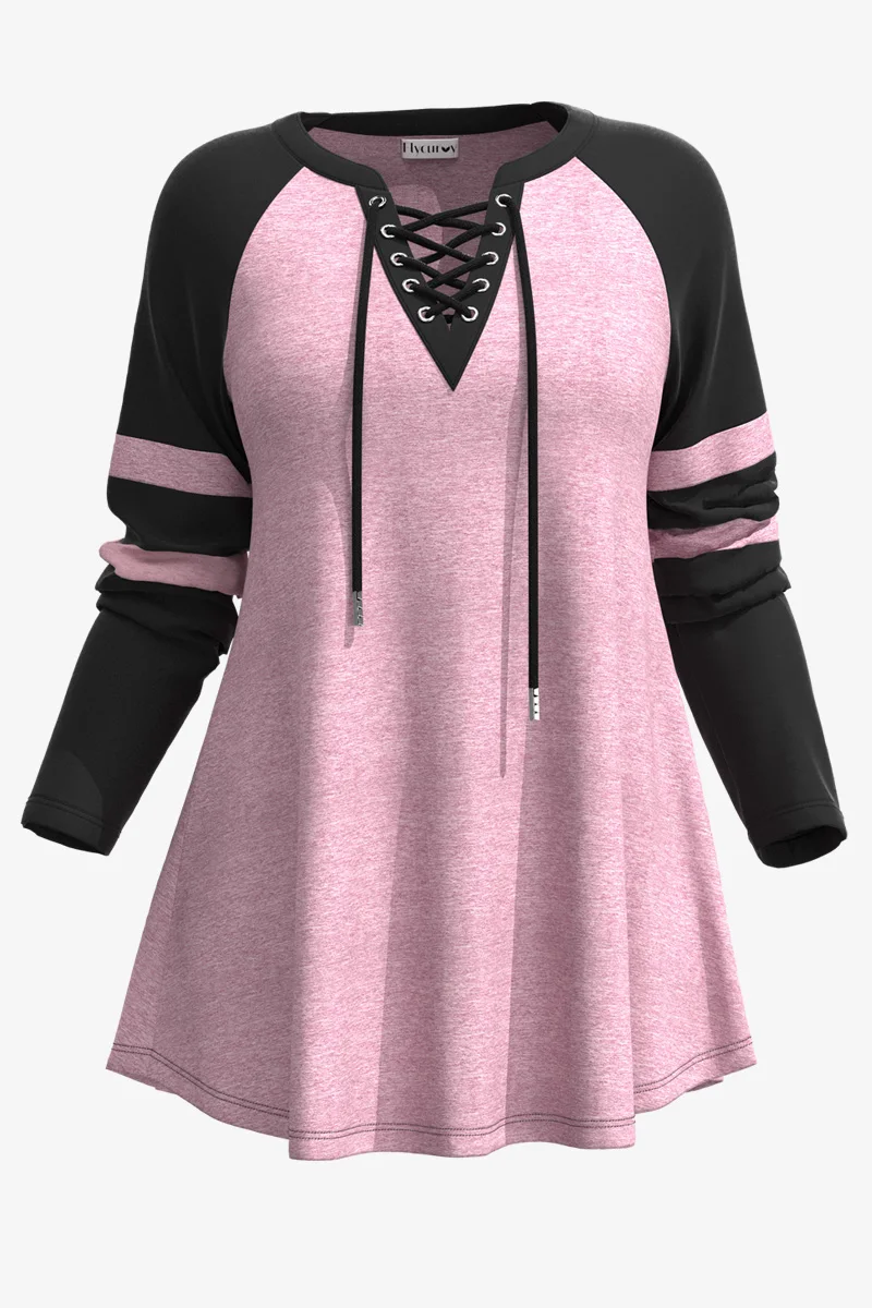 Women Long Sleeve T shirt Plus Size Casual Pink Colorblock Cross Lace-Up V Neck T shirt Loose Casual Splice Medium Stretch Tops