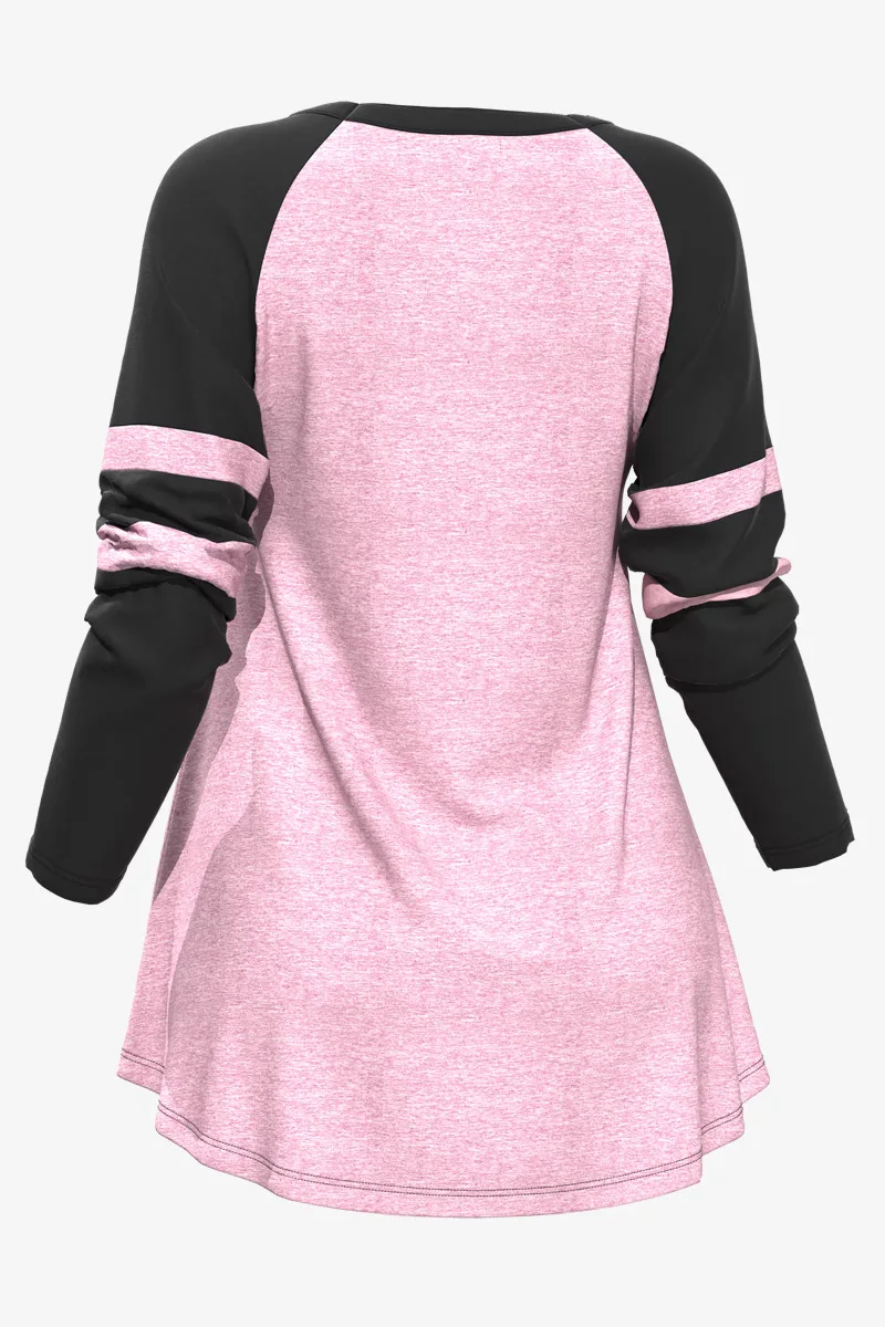Plus Size Preppy Blouse, Women's Plus Colorblock Lace Up Long Sleeve Medium Stretch T-shirt