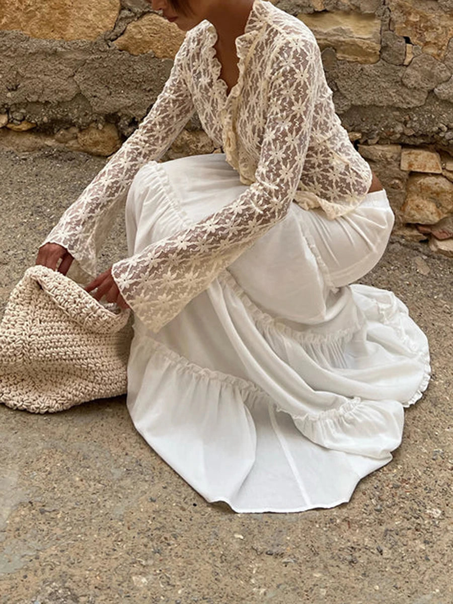 Women s Summer Lace Shirt Tops Y2k Flare Long Sleeve Tie Front Sheer Slim Crop Cardigan Clubwear