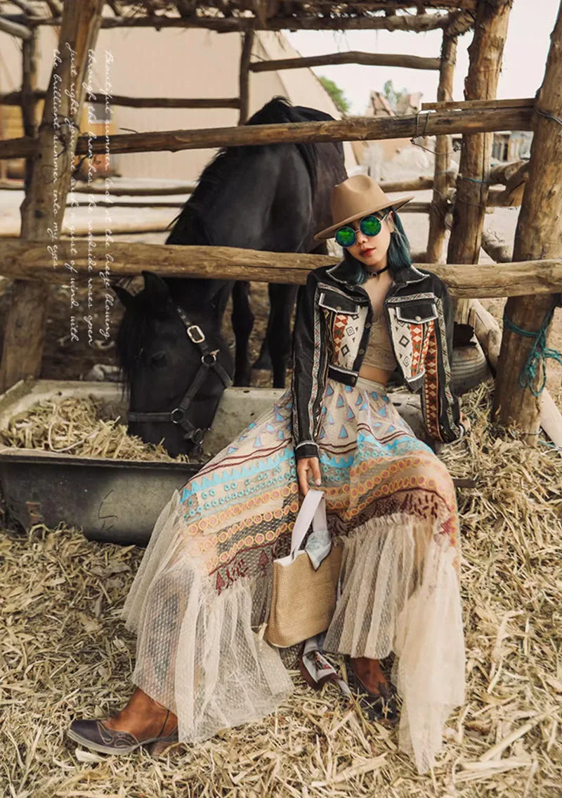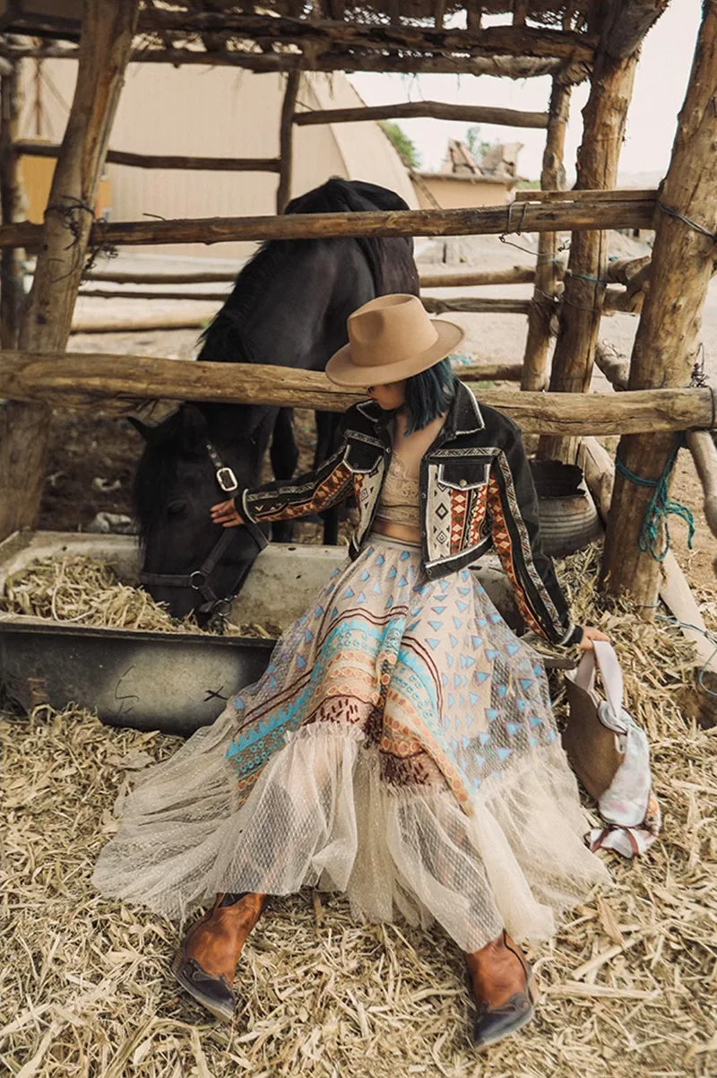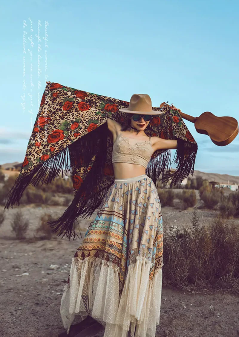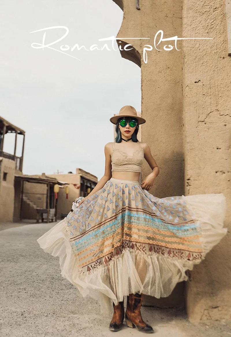 Women‘s Travel Holiday Wear Bohemian Colorful Embroidery Lace Ruffles Skirt Asymmetrical Hem Skirt Female Shiny Gold Mesh Skirts