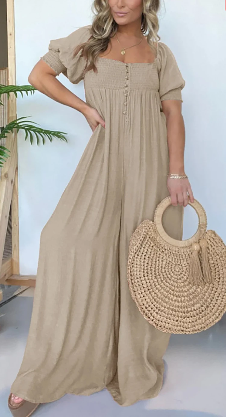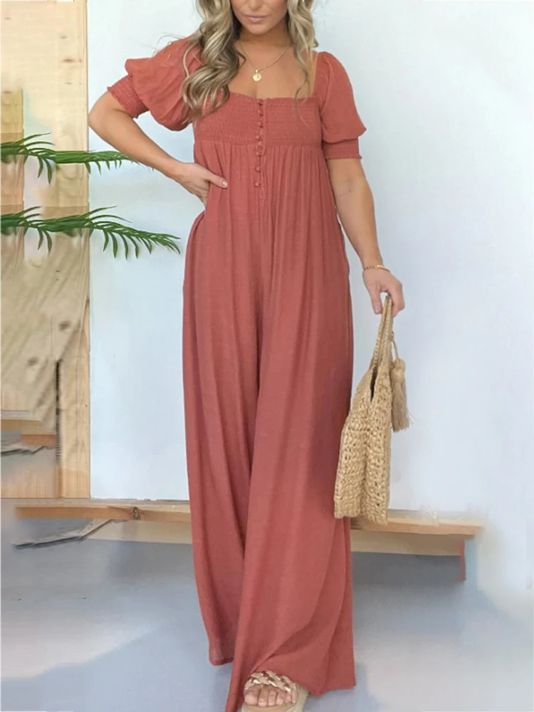 Women Solid Wide Leg Jumpsuits Lantern Sleeve Square Neck Overalls Spring Summer Short Sleeve Loose Boho Holiday Ladies Jumpsuit